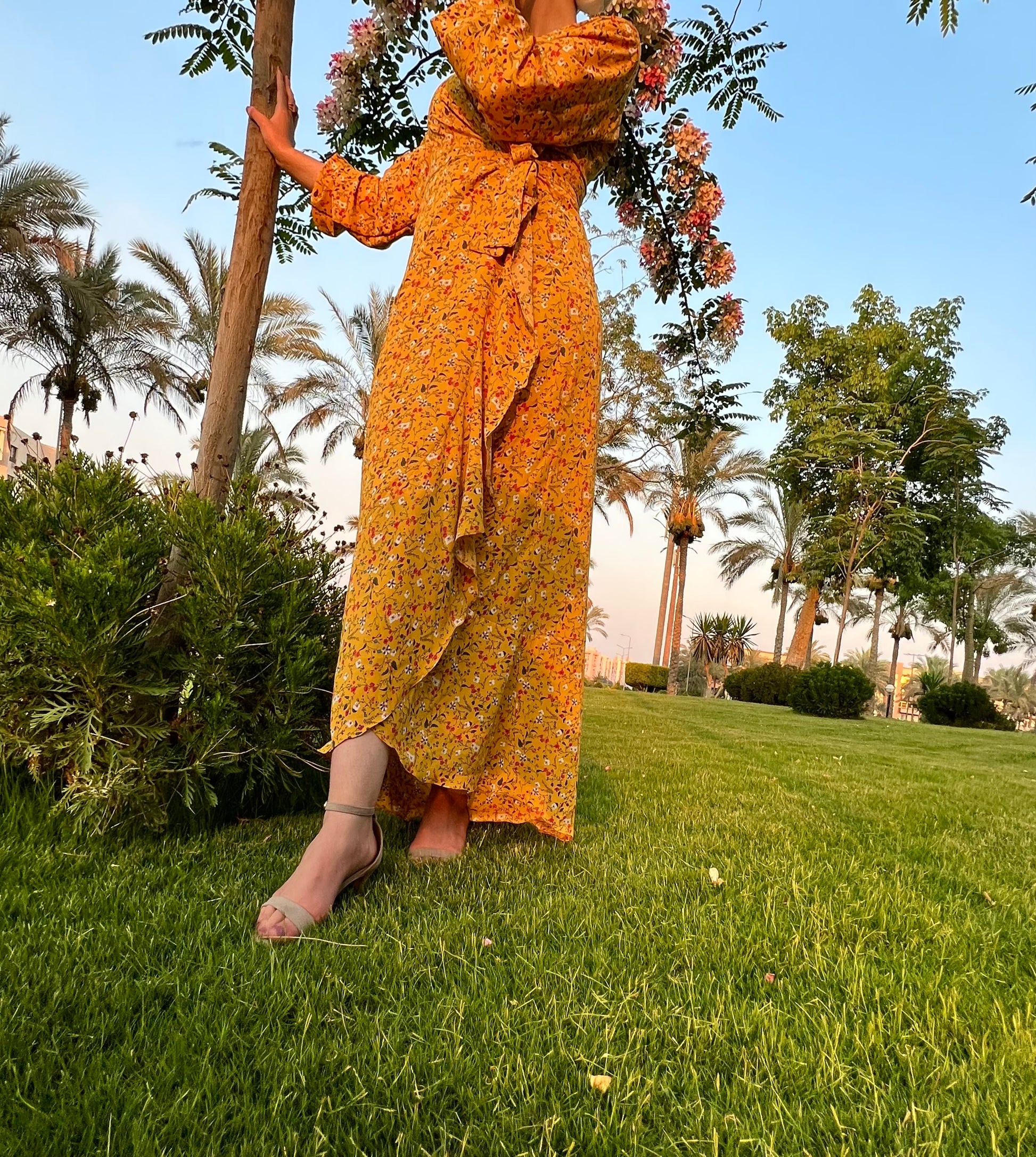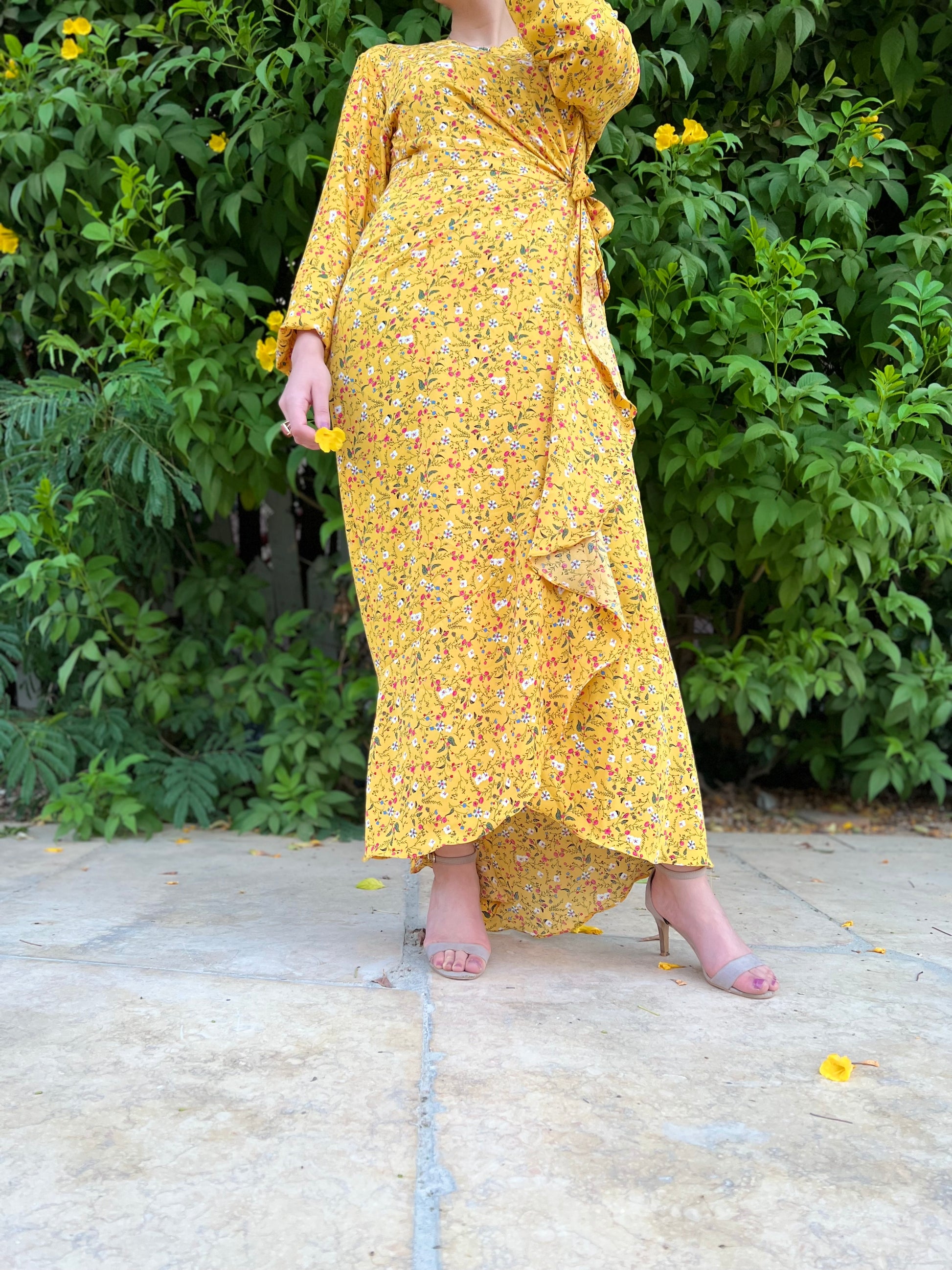 Expertly designed for versatility and style, our Daffodil dress is a must-have addition to your wardrobe. Made from breathable crepe fabric in a stunning yellow color with a floral pattern, this dress is perfect for any occasion. Whether you're heading to a wedding or a day out with friends, our dress will keep you comfortable and looking effortlessly chic.