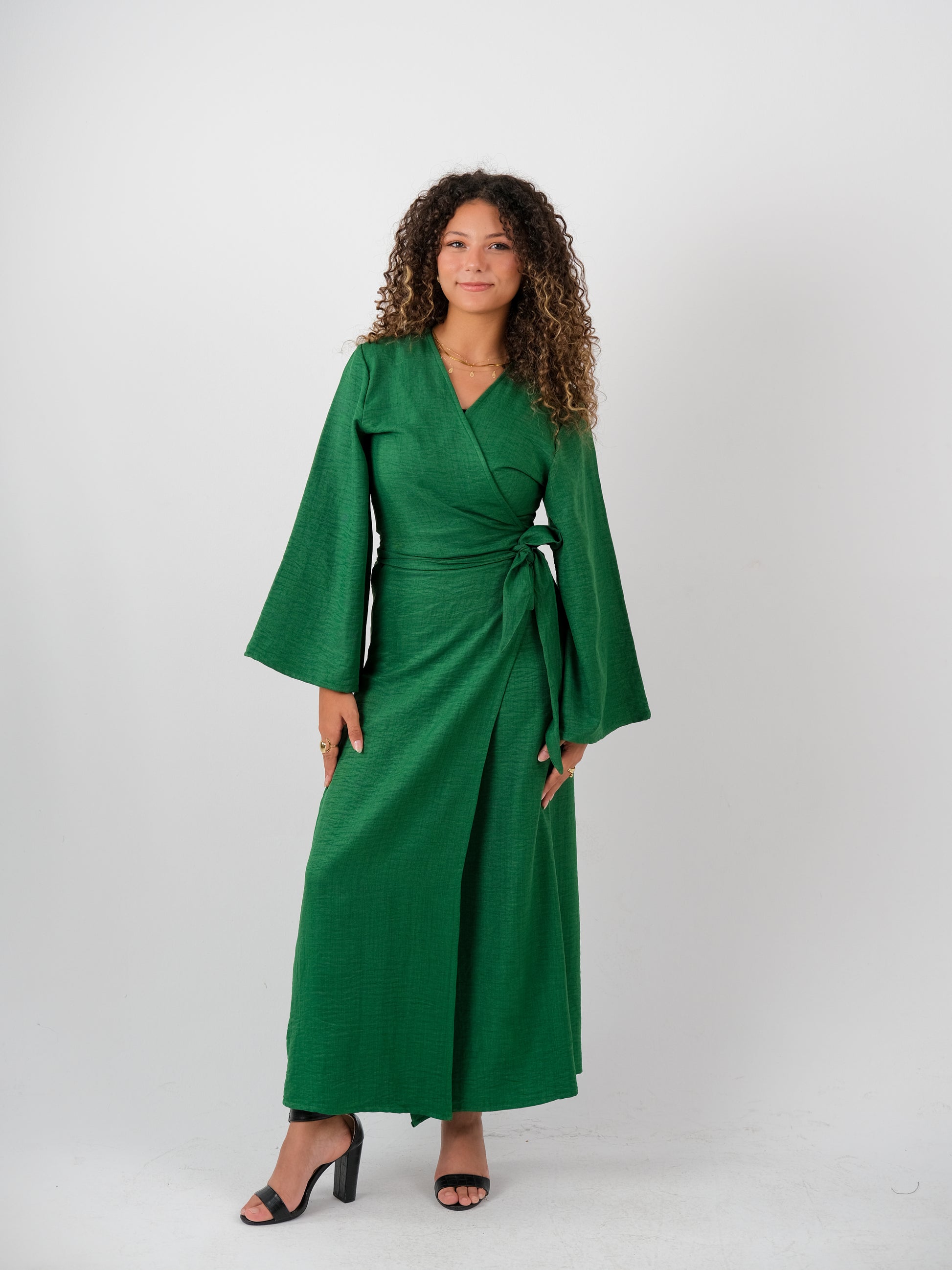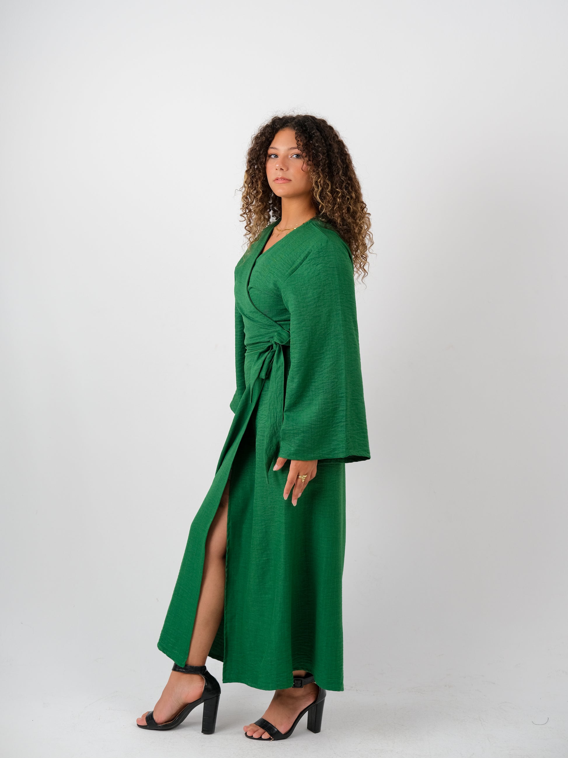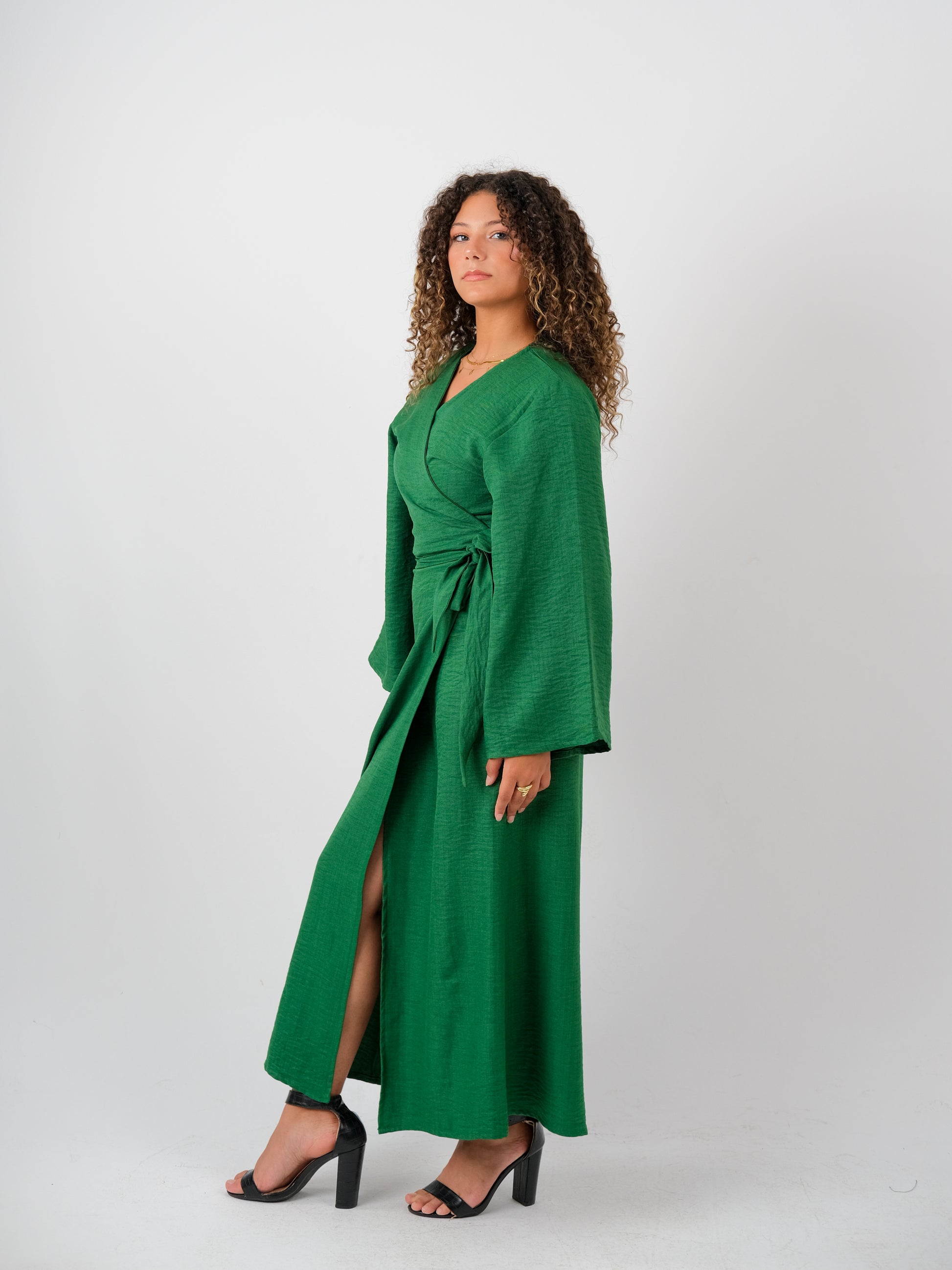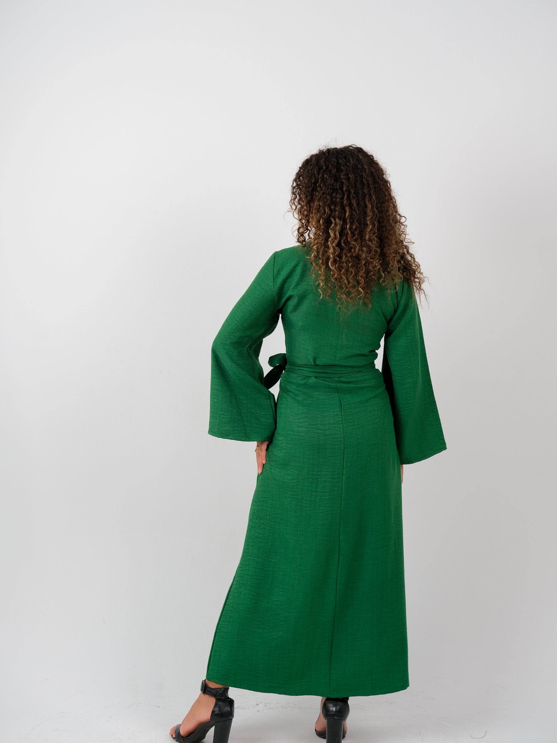 This linen kimono/Dress is a versatile addition to any wardrobe. Its unique design allows it to be worn as both a kimono and a wrap dress, perfect for a variety of events. Made of high-quality linen, it offers comfort and style in equal measure. Embrace both fashion and function with this must-have piece.