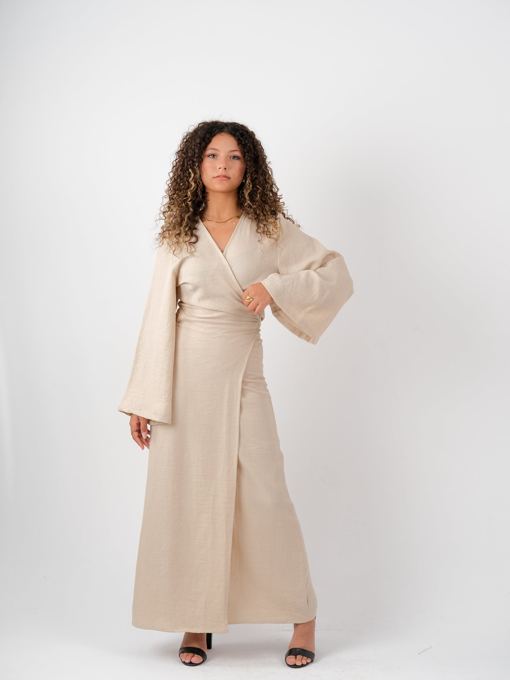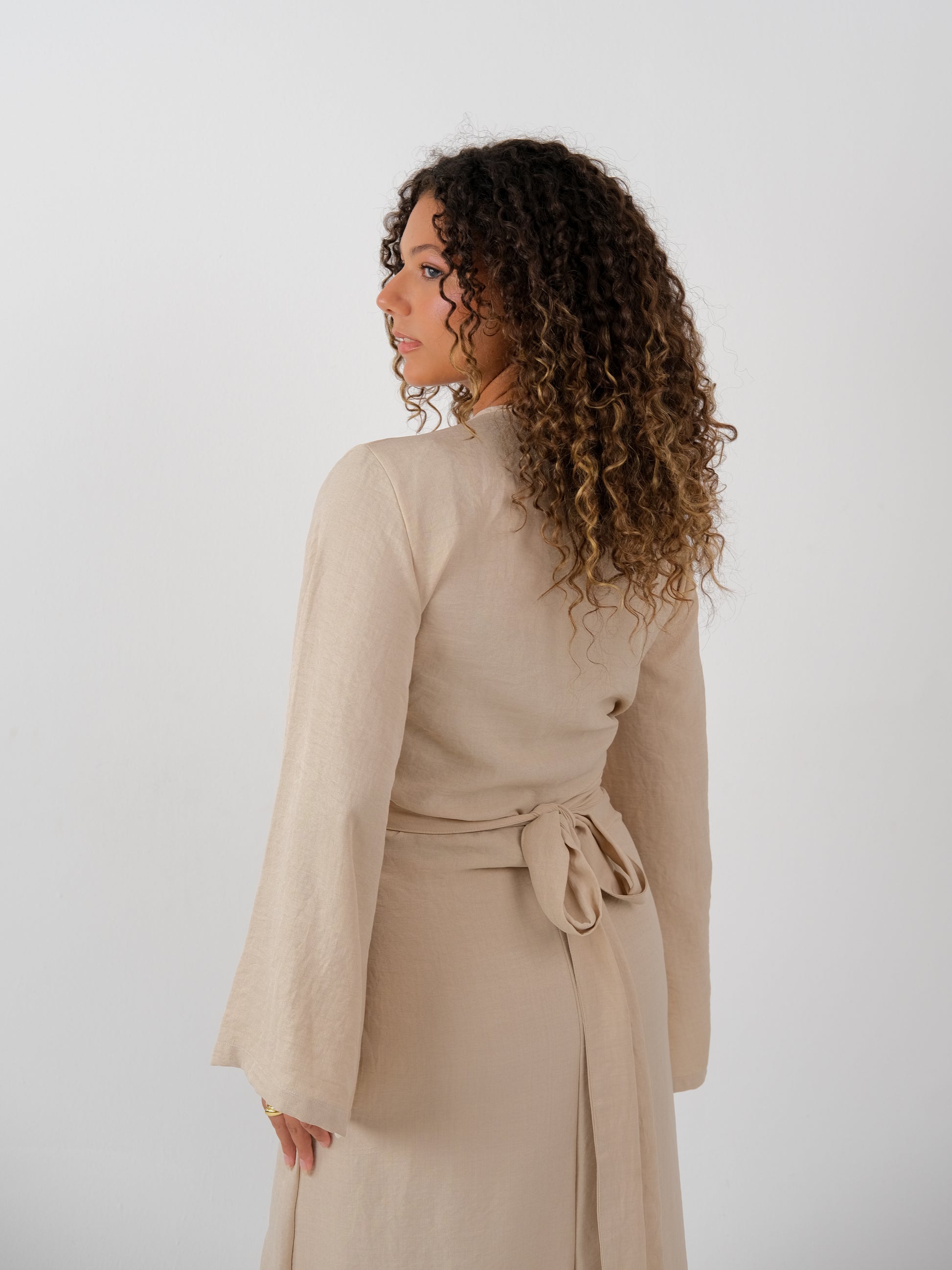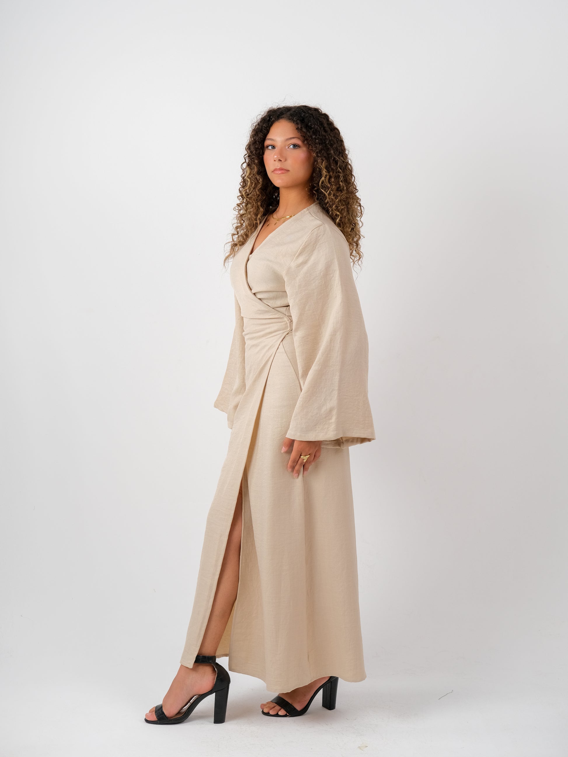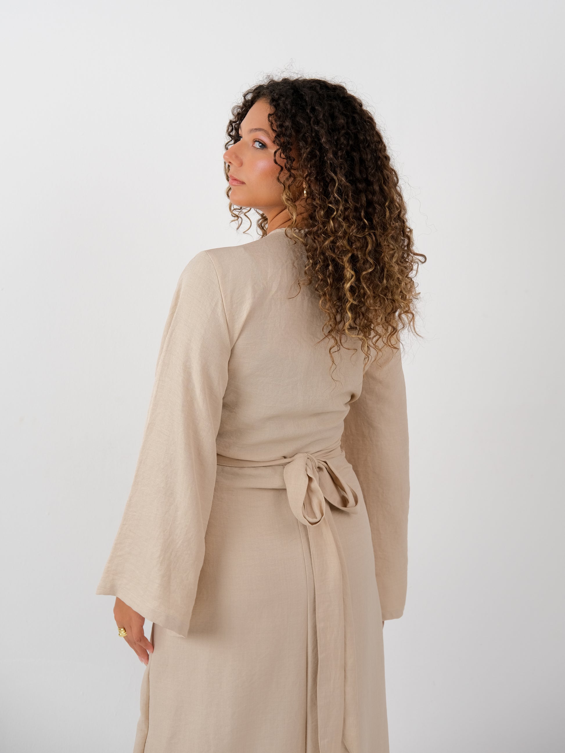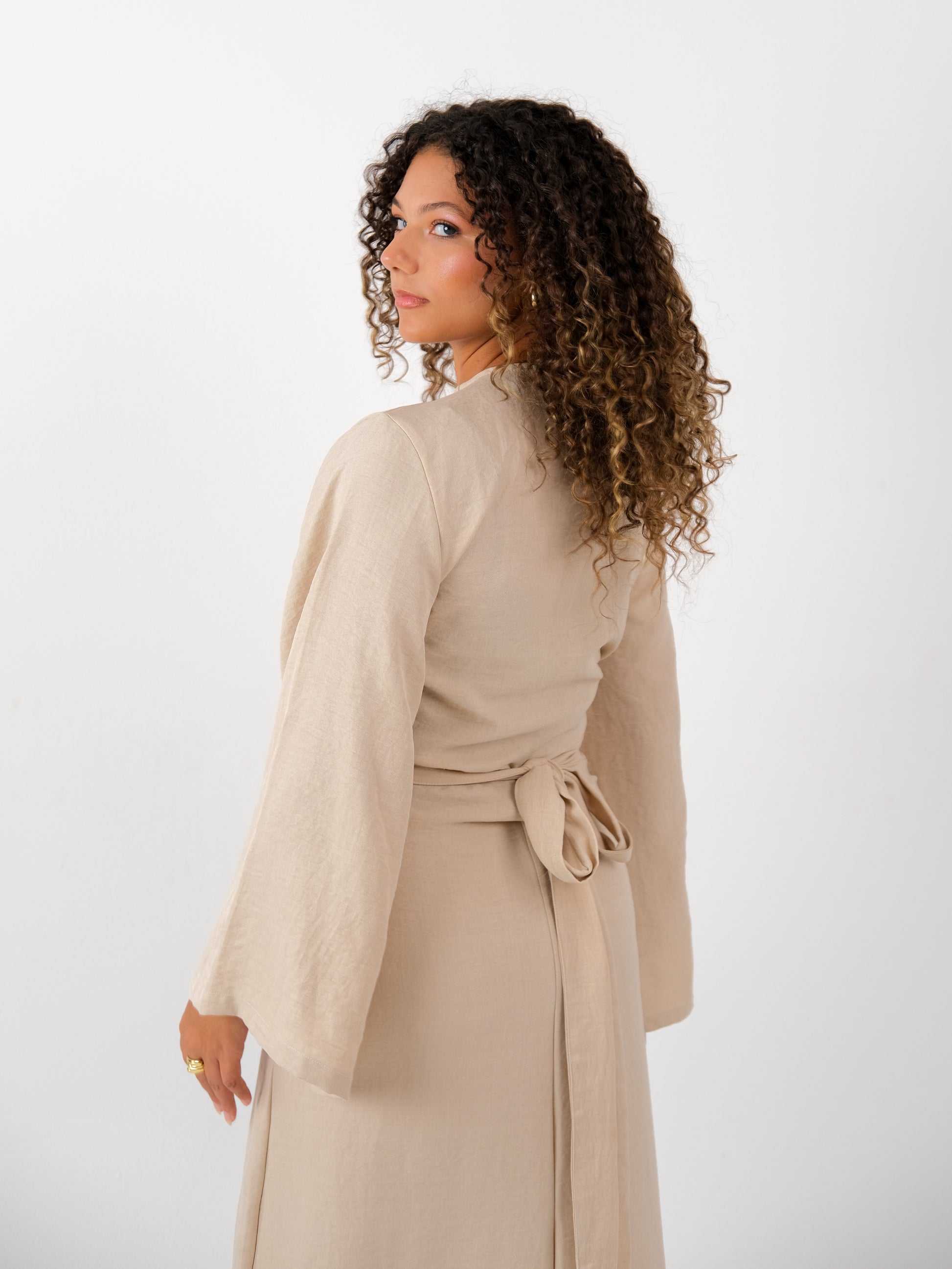 This linen kimono/Dress is a versatile addition to any wardrobe. Its unique design allows it to be worn as both a kimono and a wrap dress, perfect for a variety of events. Made of high-quality linen, it offers comfort and style in equal measure. Embrace both fashion and function with this must-have piece.