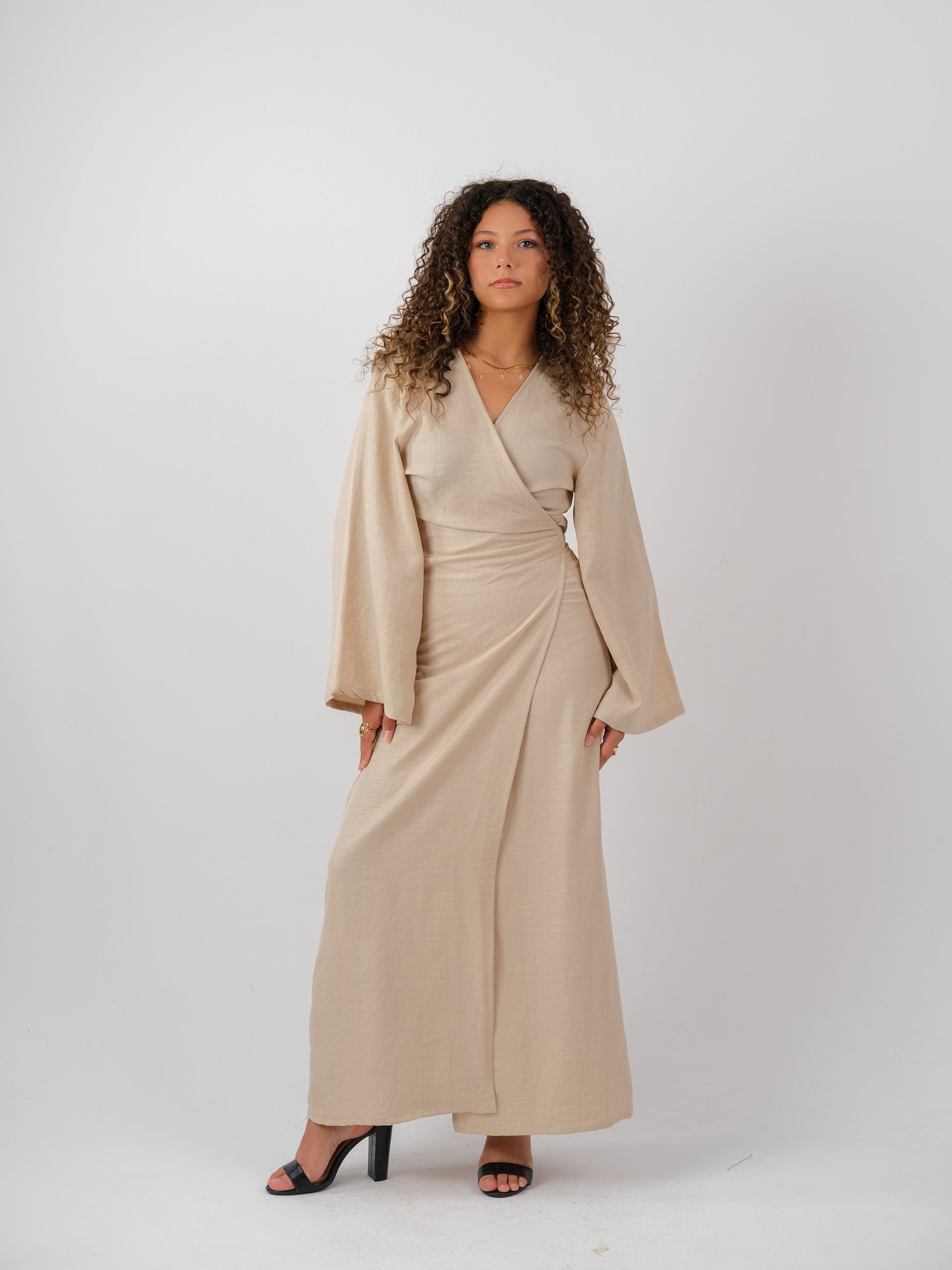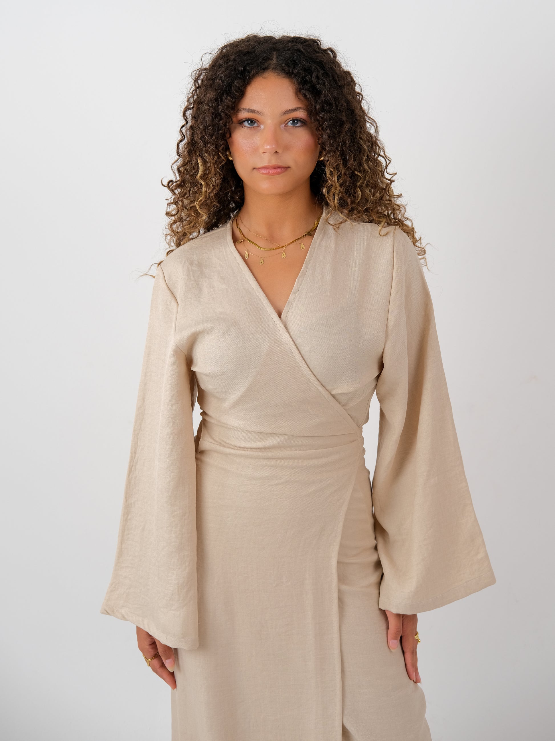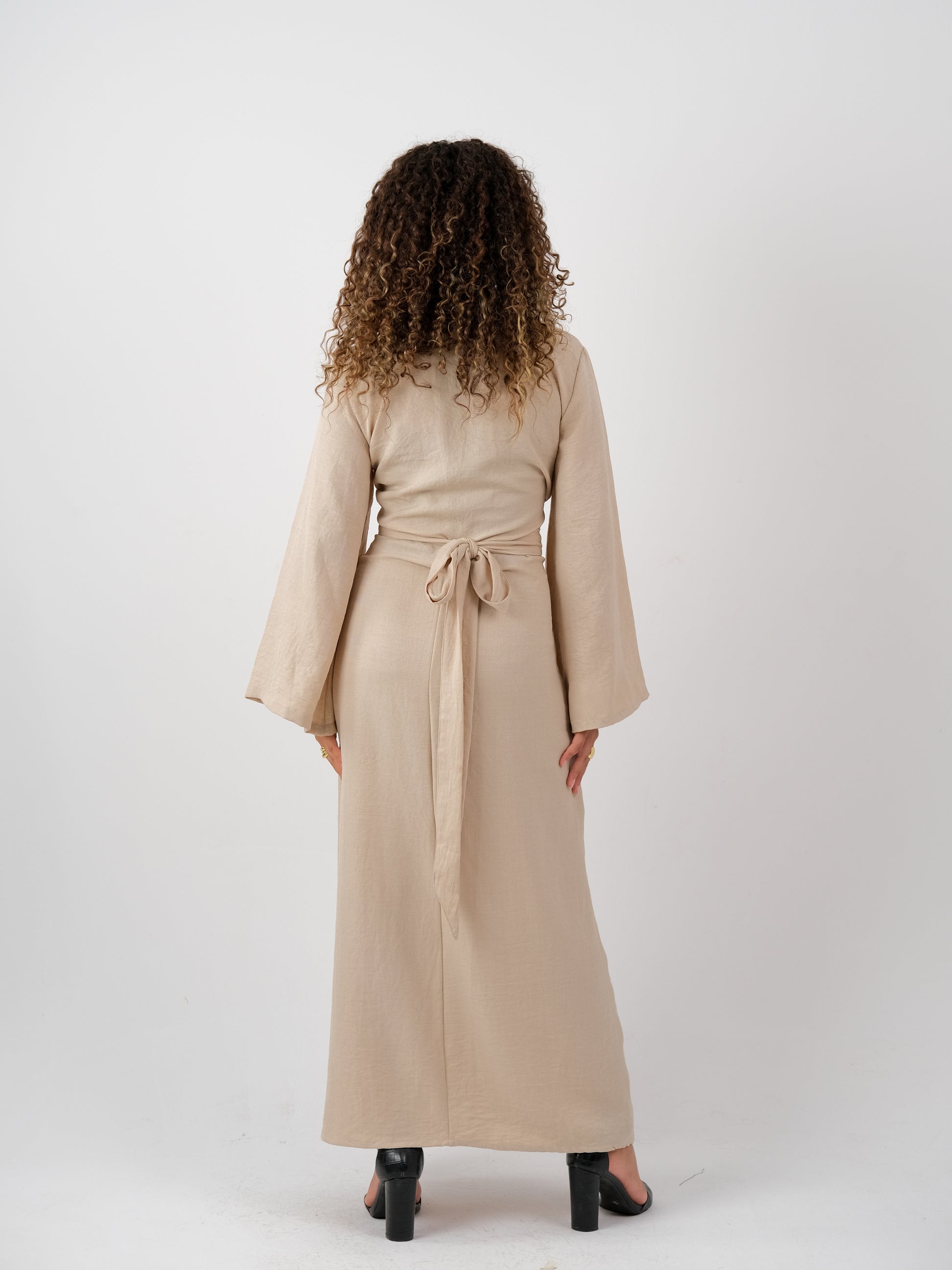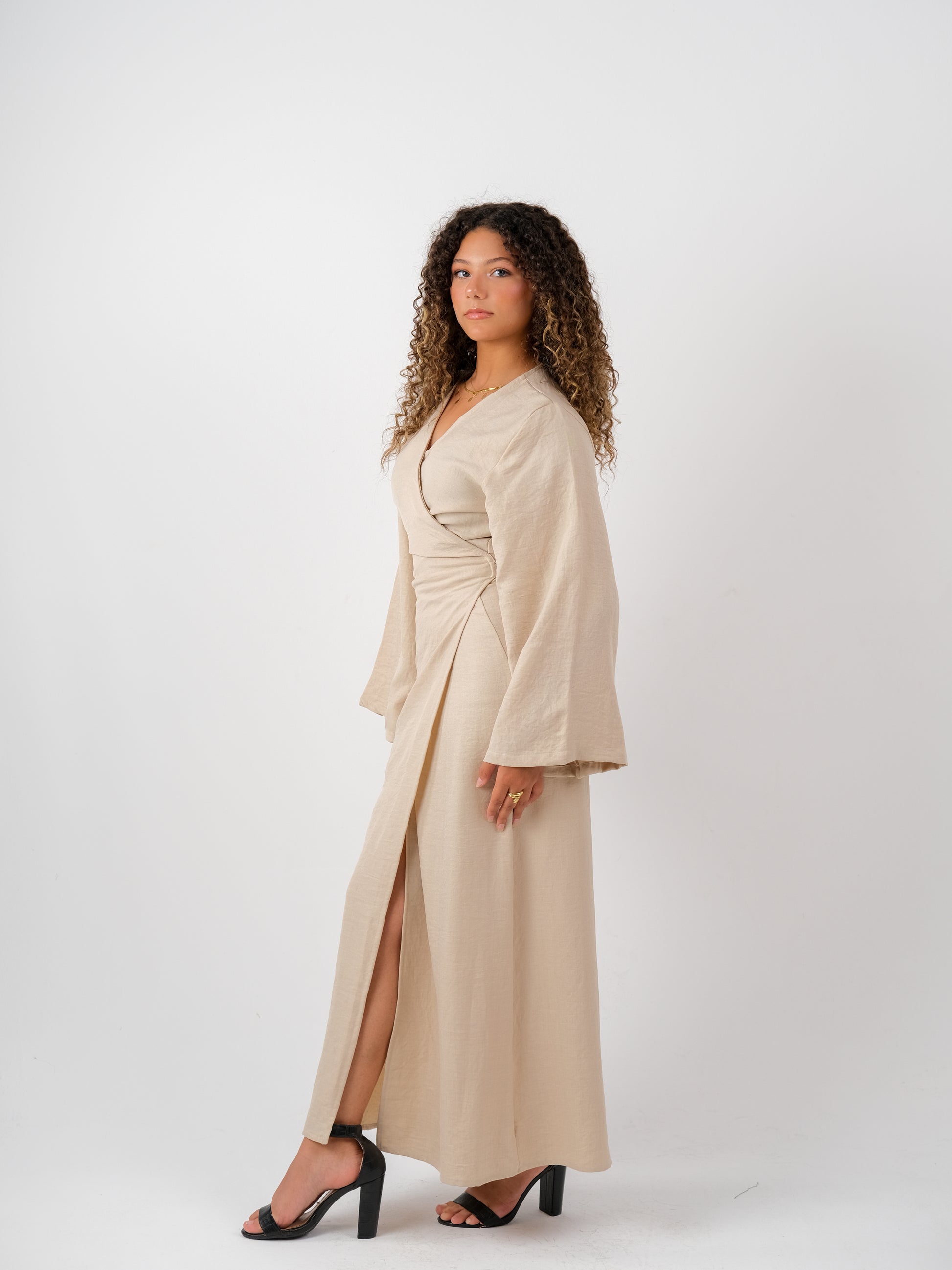 This linen kimono/Dress is a versatile addition to any wardrobe. Its unique design allows it to be worn as both a kimono and a wrap dress, perfect for a variety of events. Made of high-quality linen, it offers comfort and style in equal measure. Embrace both fashion and function with this must-have piece.
