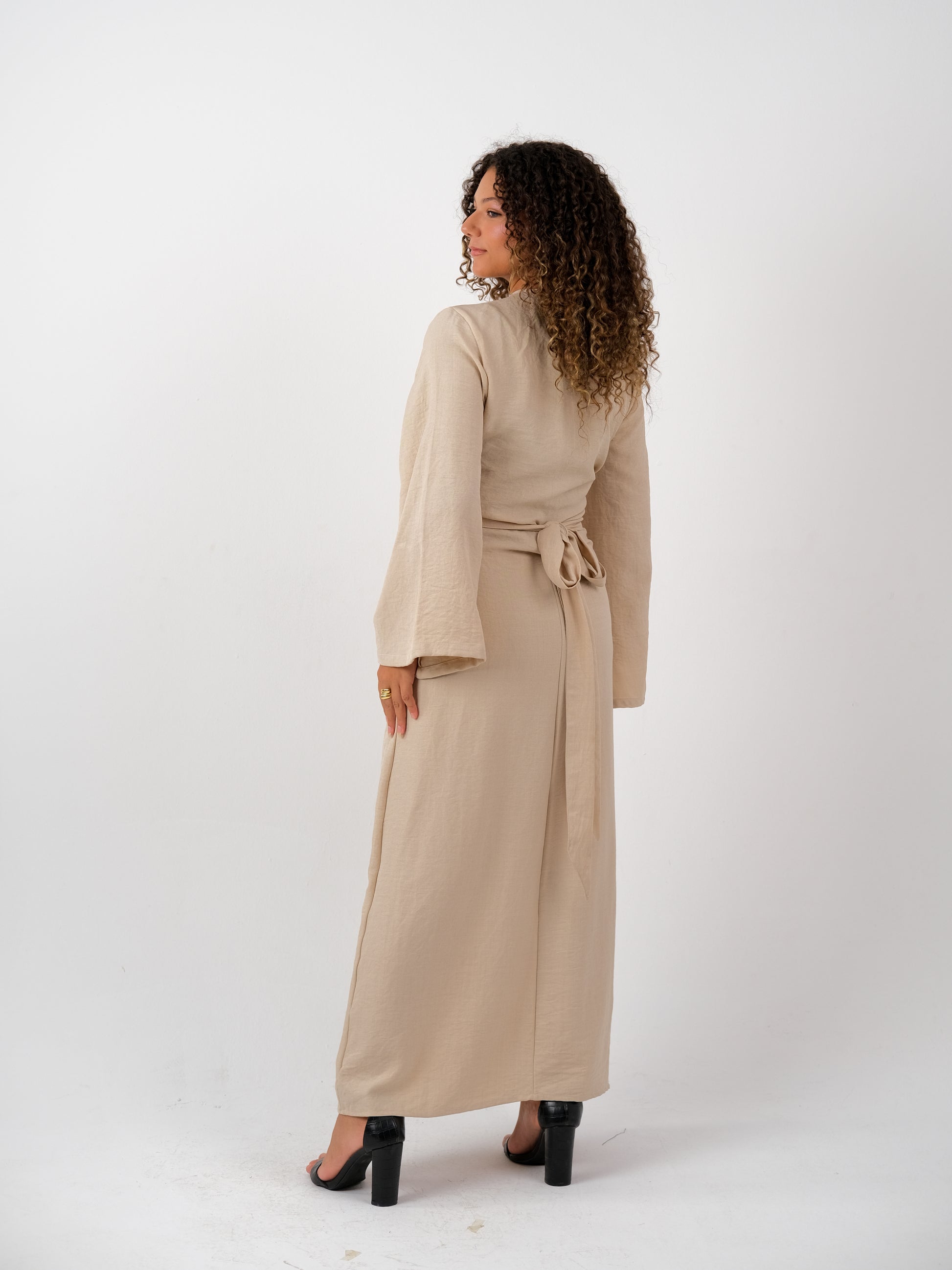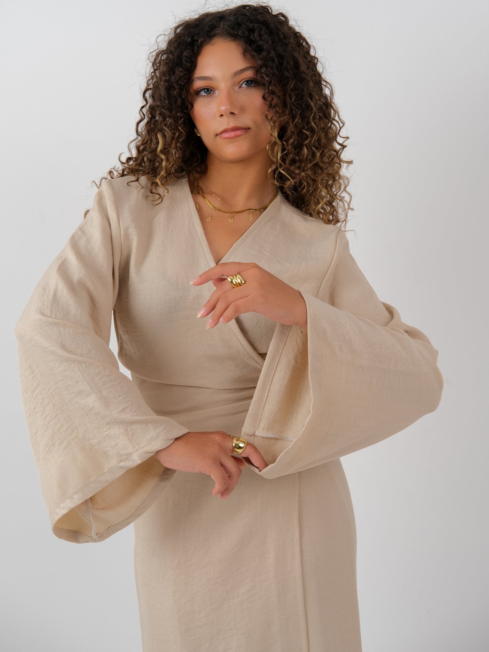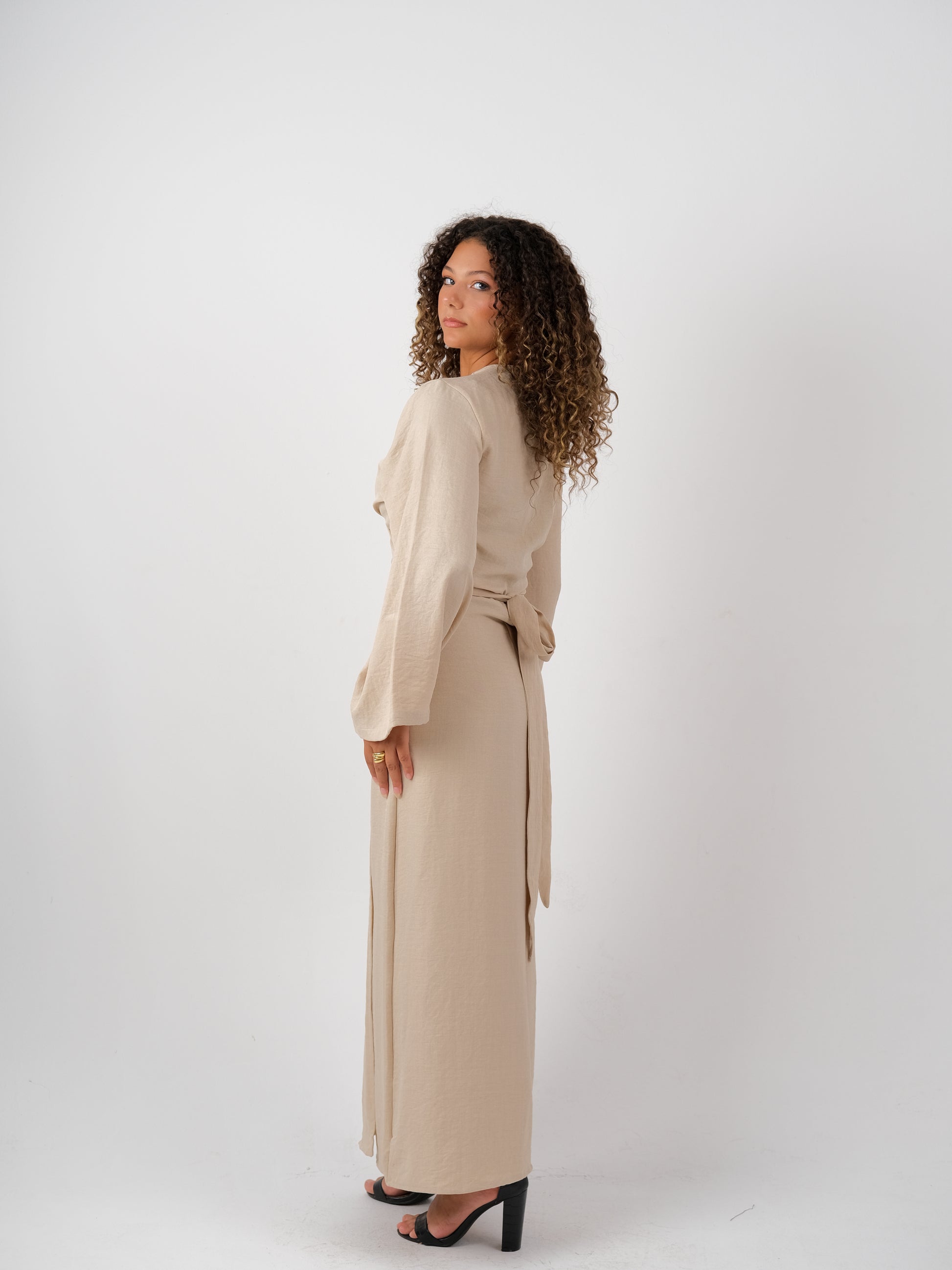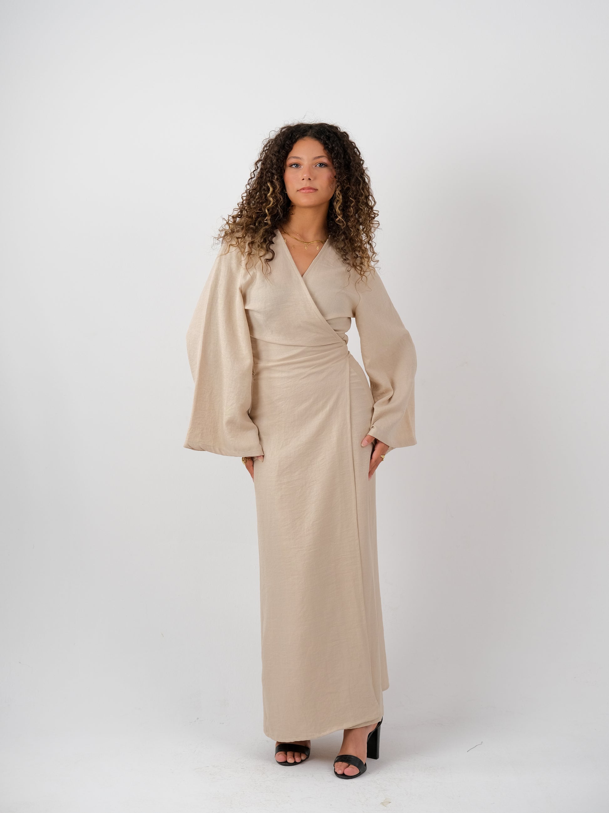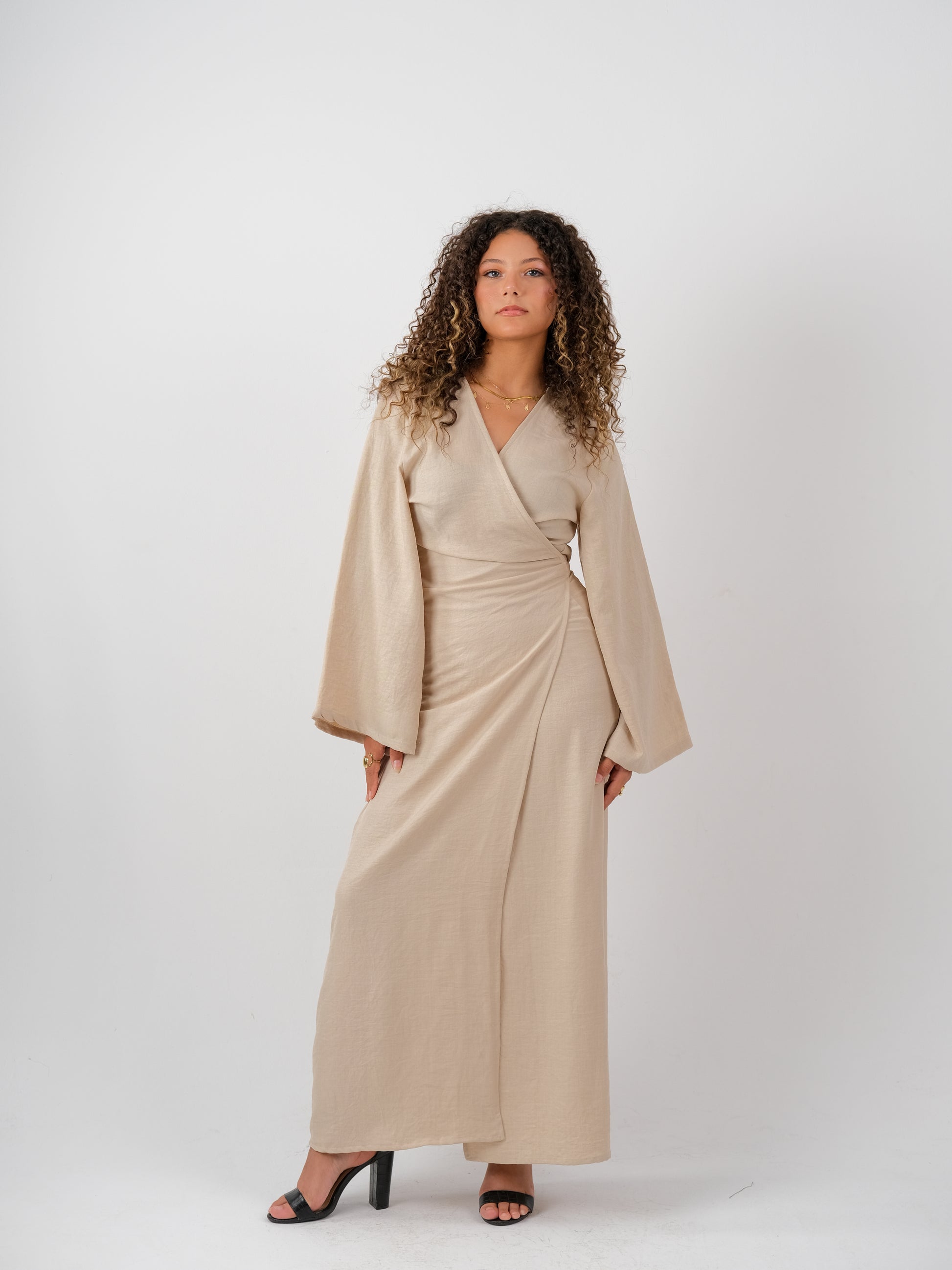 This linen kimono/Dress is a versatile addition to any wardrobe. Its unique design allows it to be worn as both a kimono and a wrap dress, perfect for a variety of events. Made of high-quality linen, it offers comfort and style in equal measure. Embrace both fashion and function with this must-have piece.
