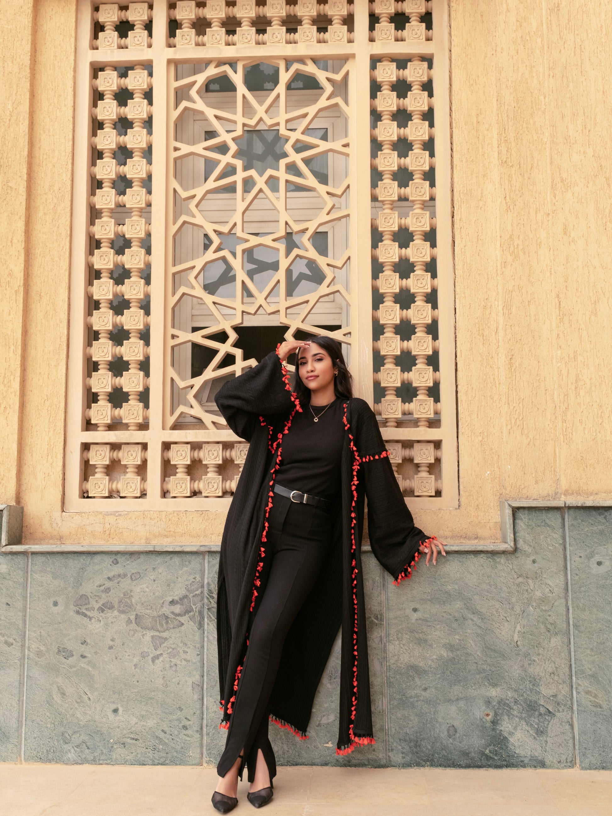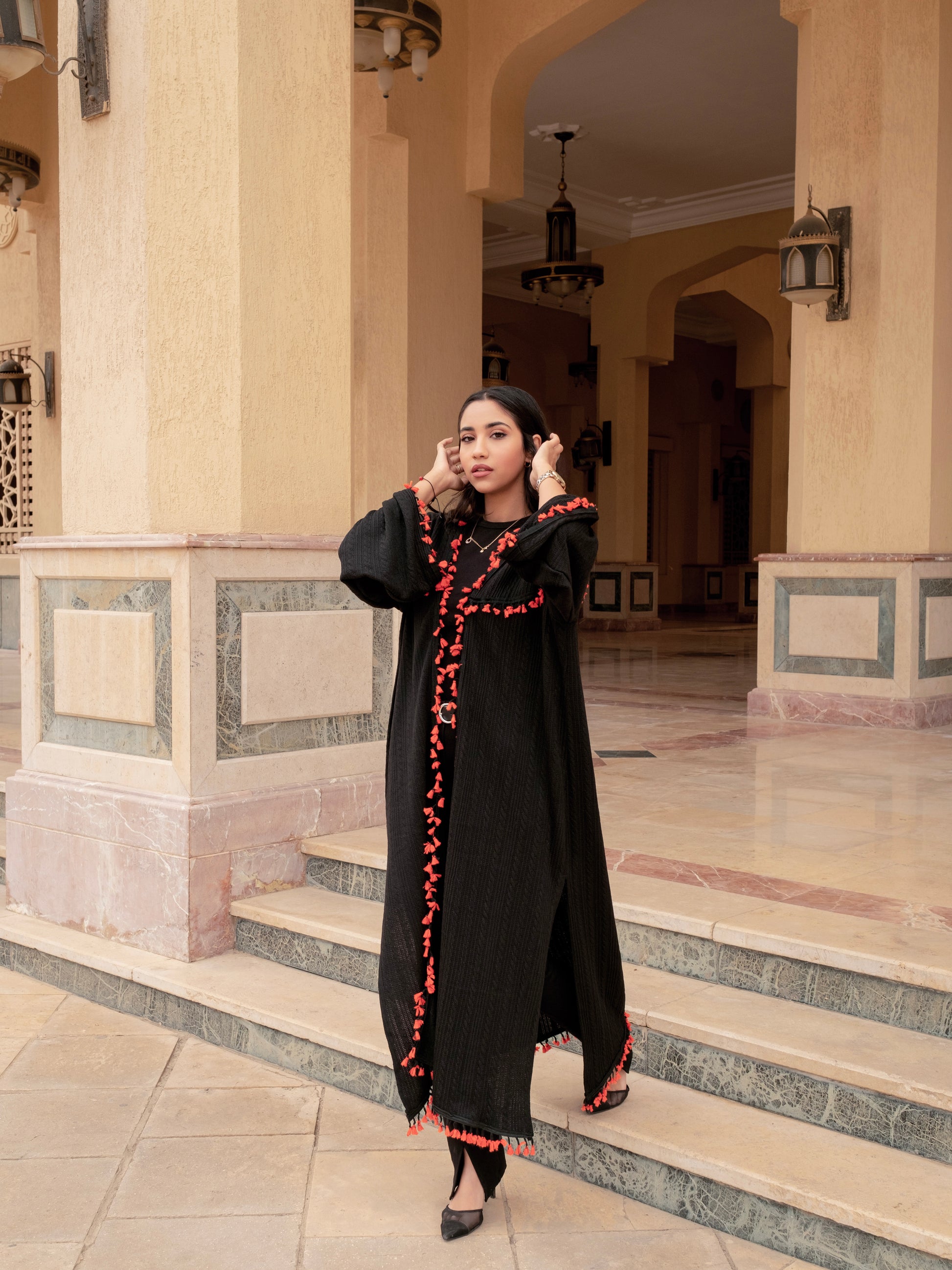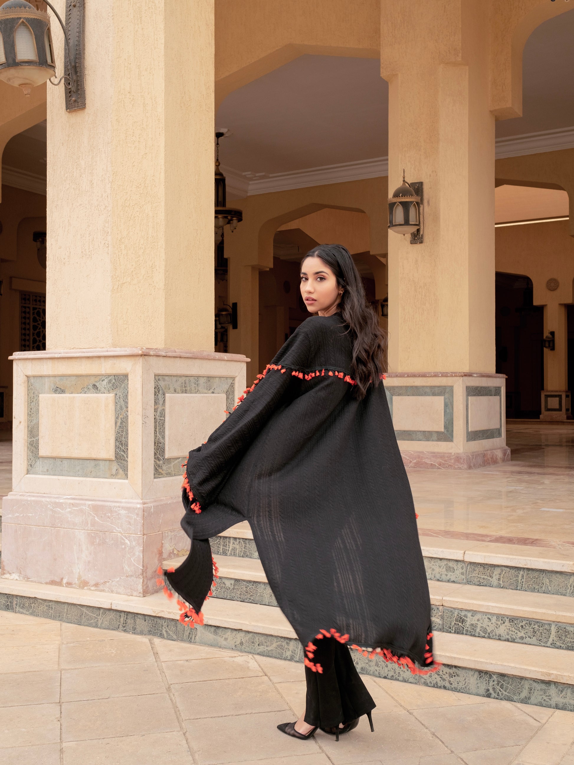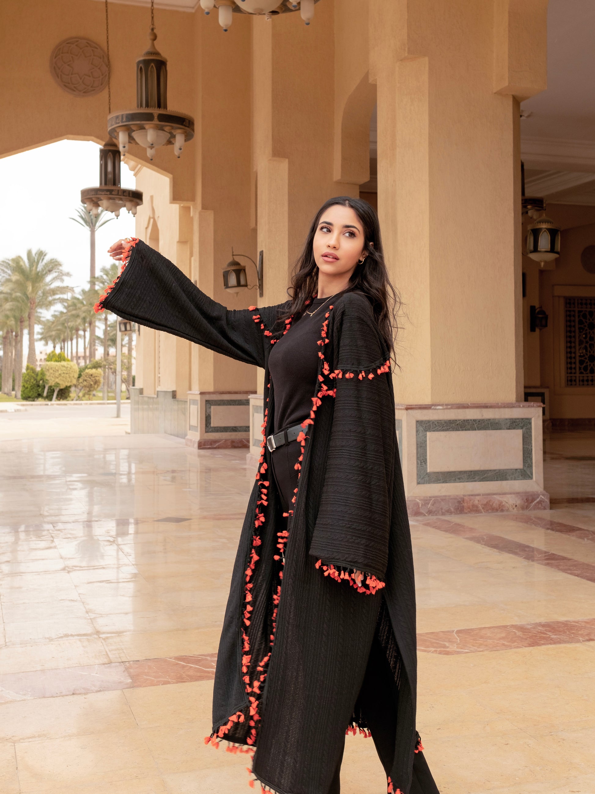 - Vibrant Orange Fringes: Eye-catching orange fringes adorn the sleeves, all edges, and cascade down the back of the Layal Kimono, adding a touch of festive flair and echoing the warmth of the season.