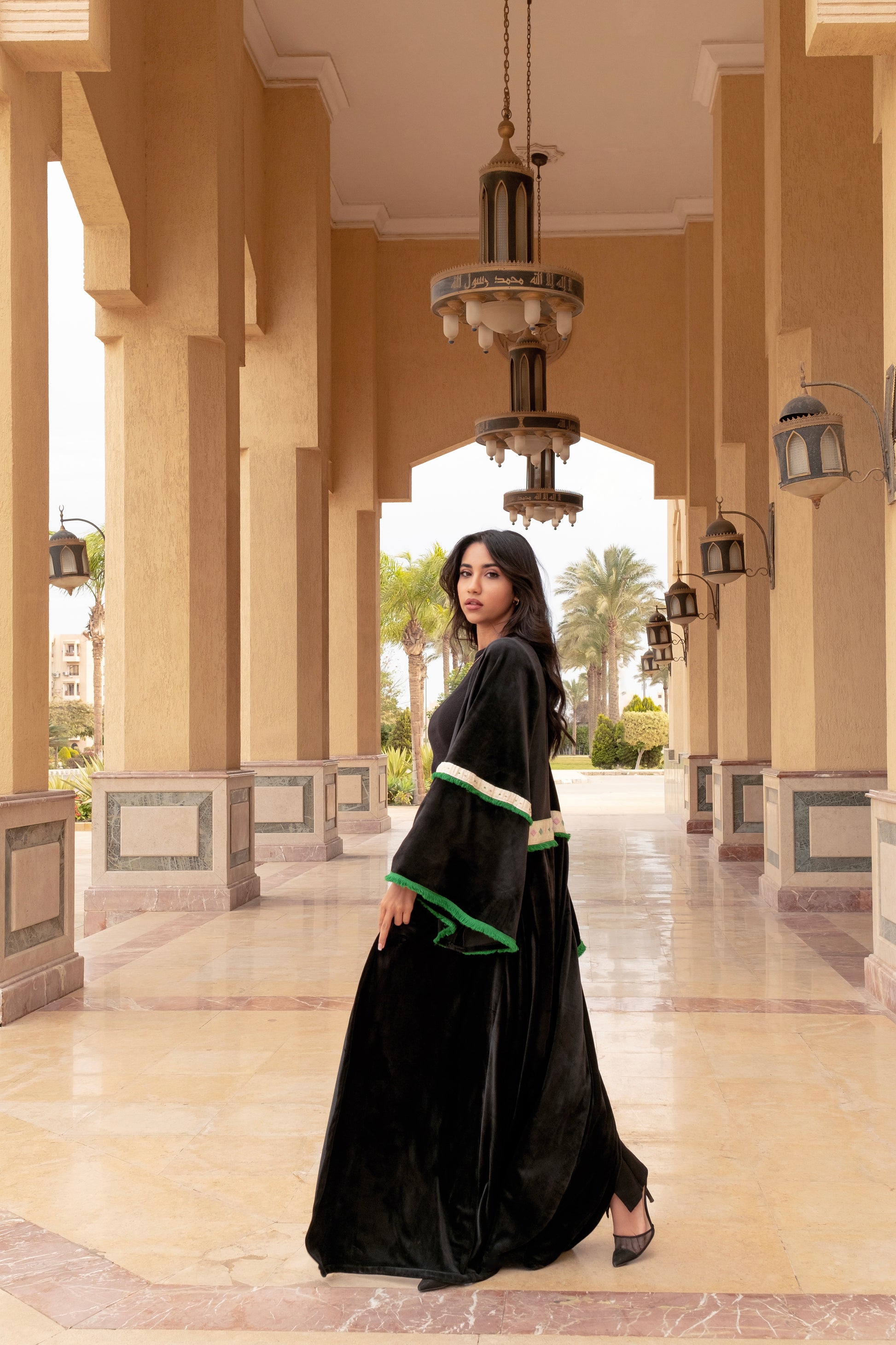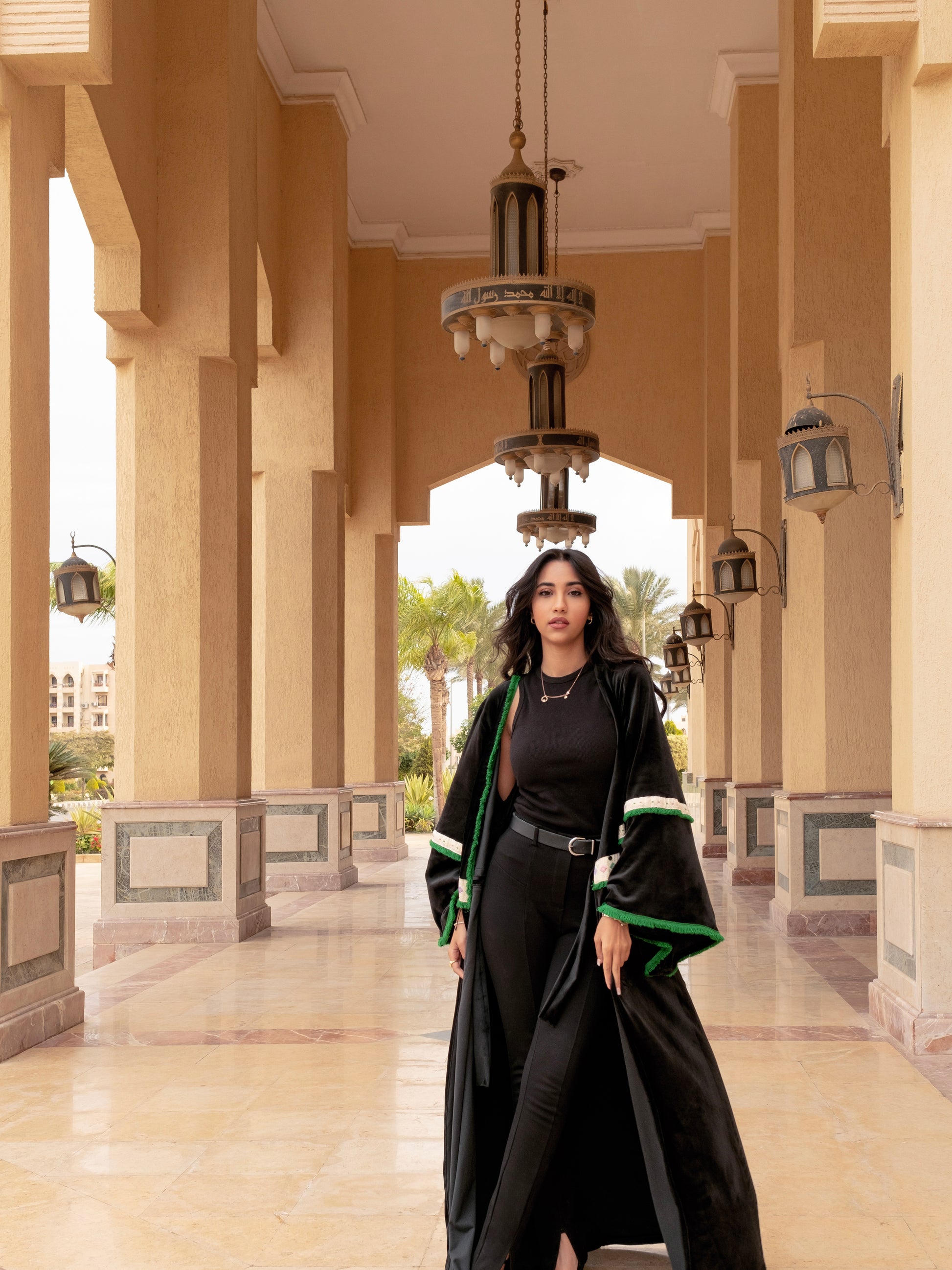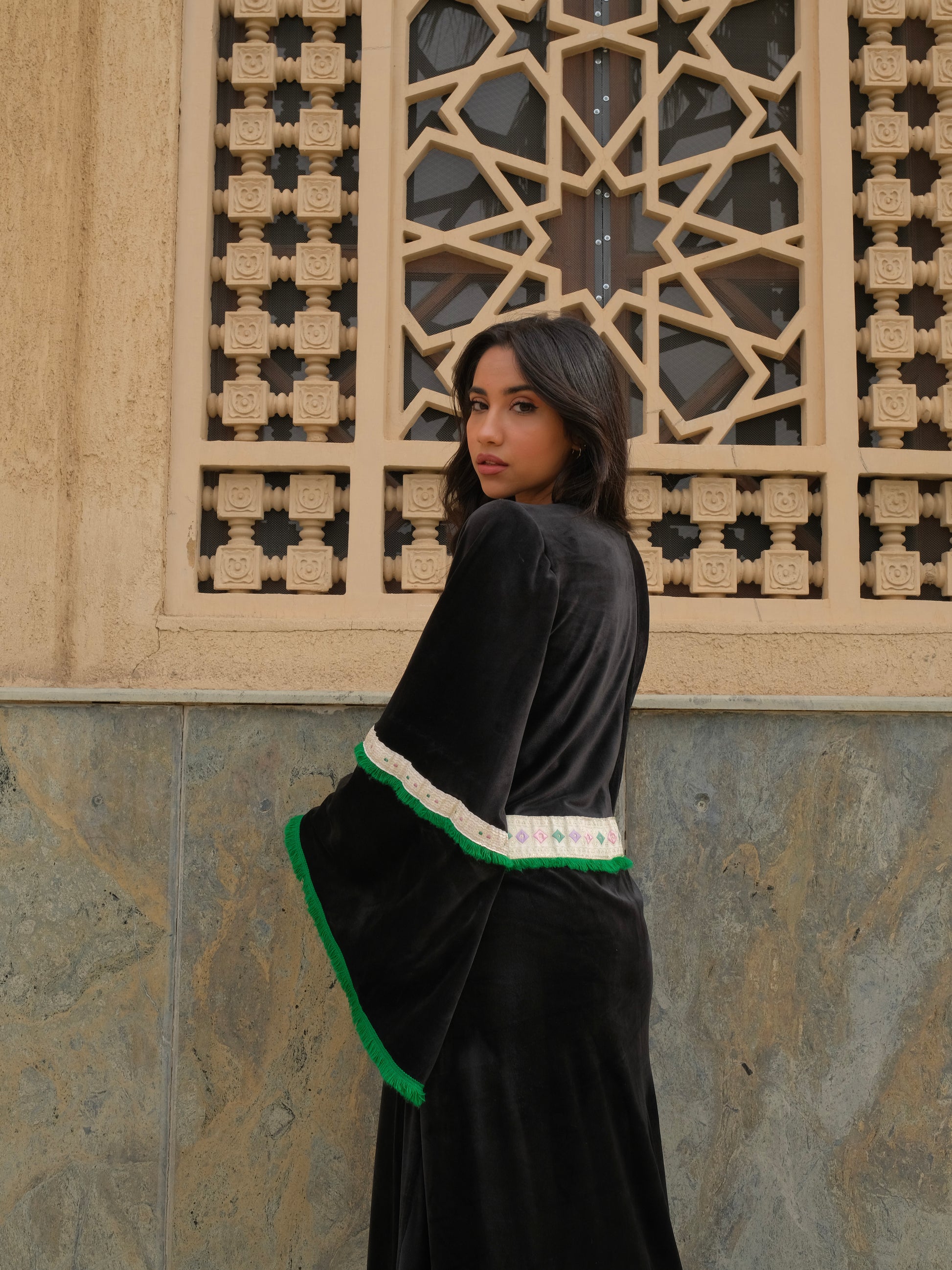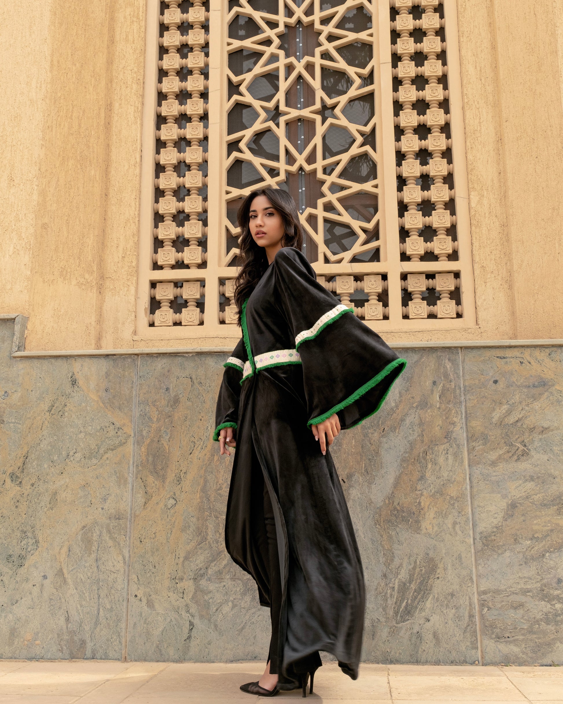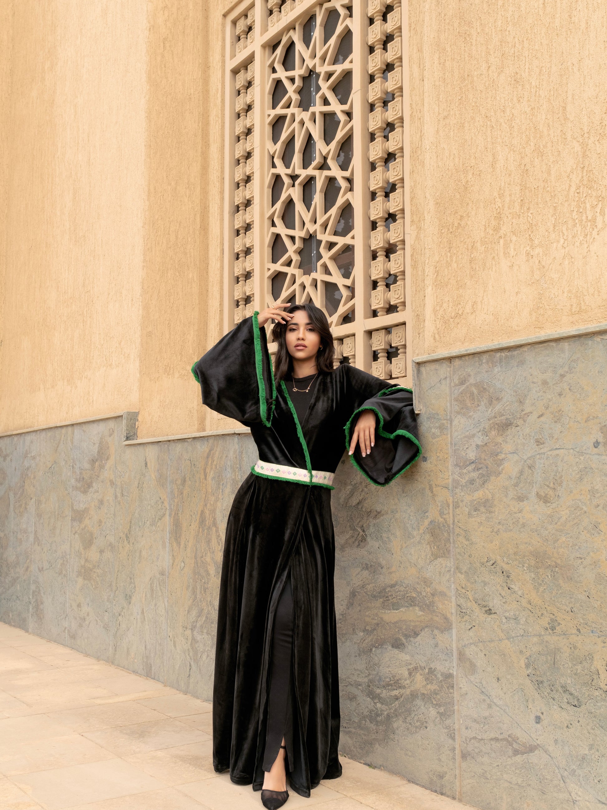 Embrace timeless elegance with the Zomord Kaftan, a captivating dance of luxurious black velvet and delicate emerald green fringes. Inspired by the rich heritage of Arabic culture, this stunning kaftan is more than just a garment, it's a piece of history.