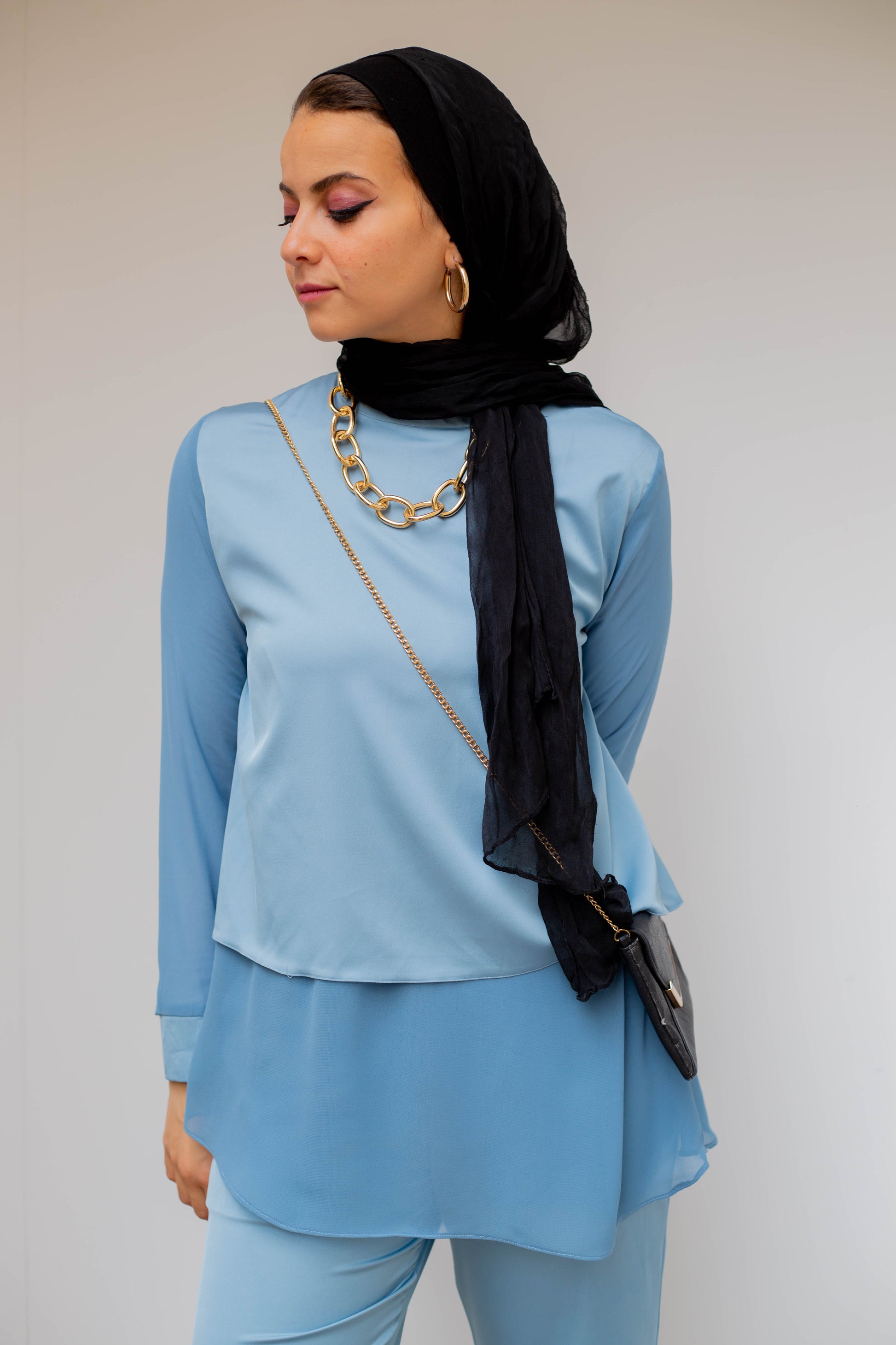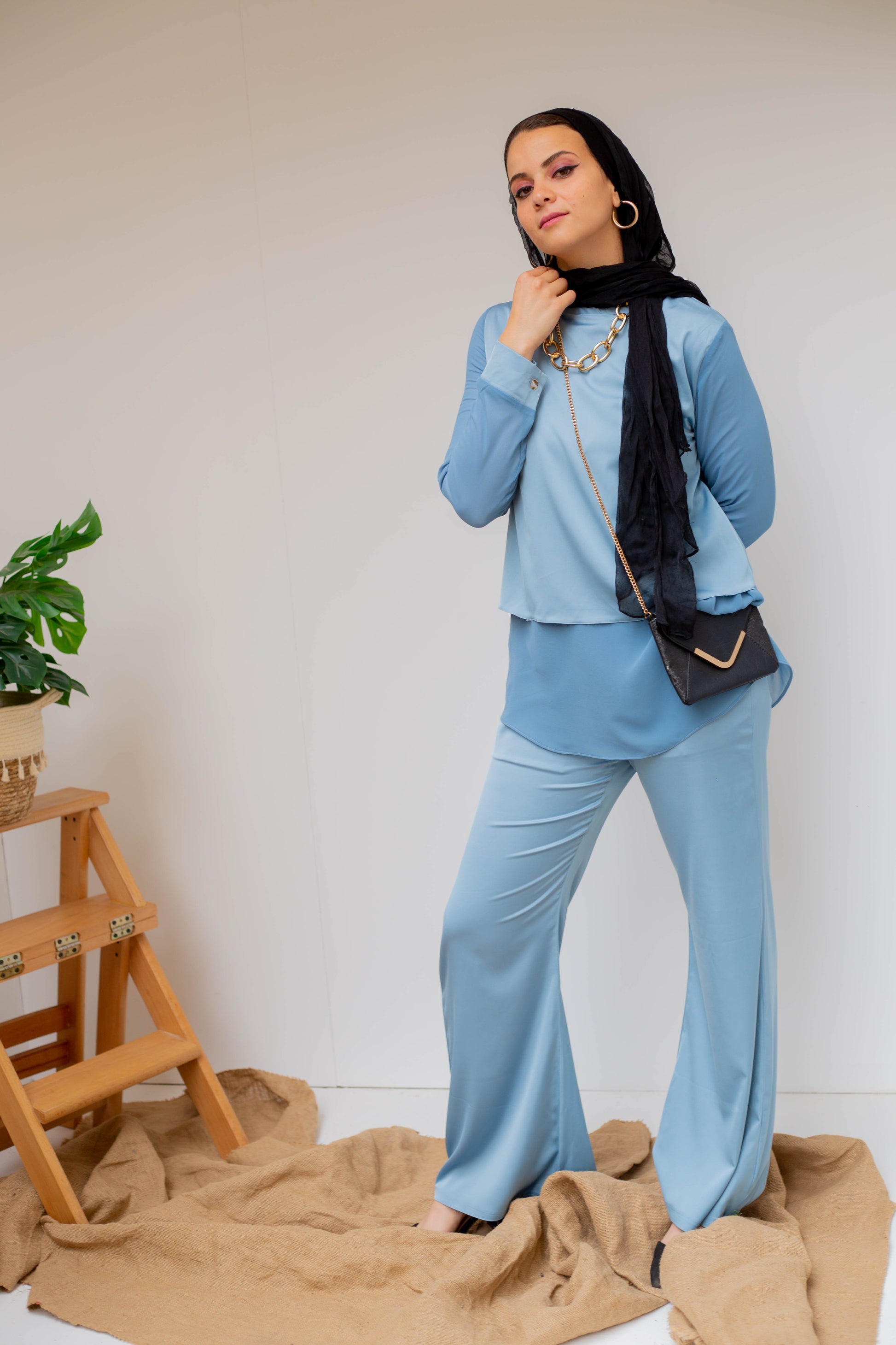 Elevate your wardrobe with our trendy light blue Satin Set, white & light blue.Crafted with a lightweight and comfortable fabric, this set exudes flawless chicness. Don't miss out on this must-have addition to your closet.
