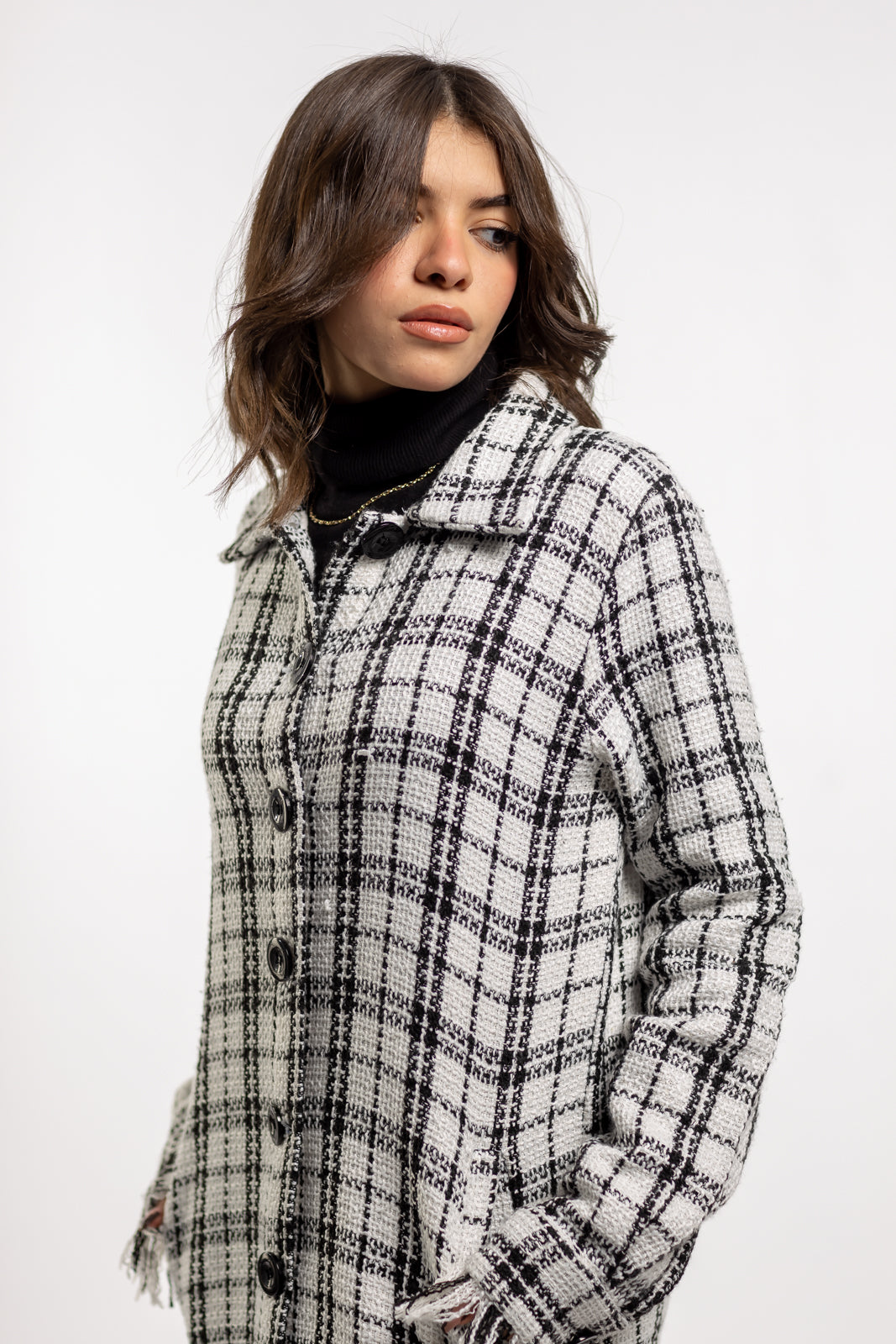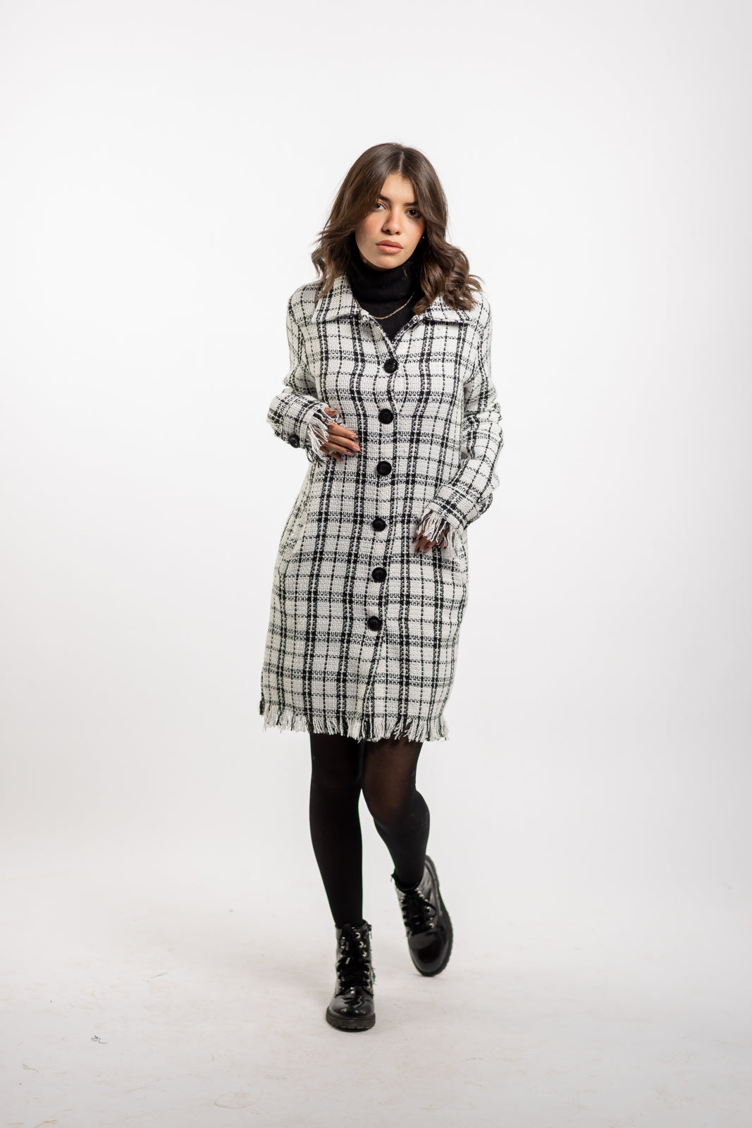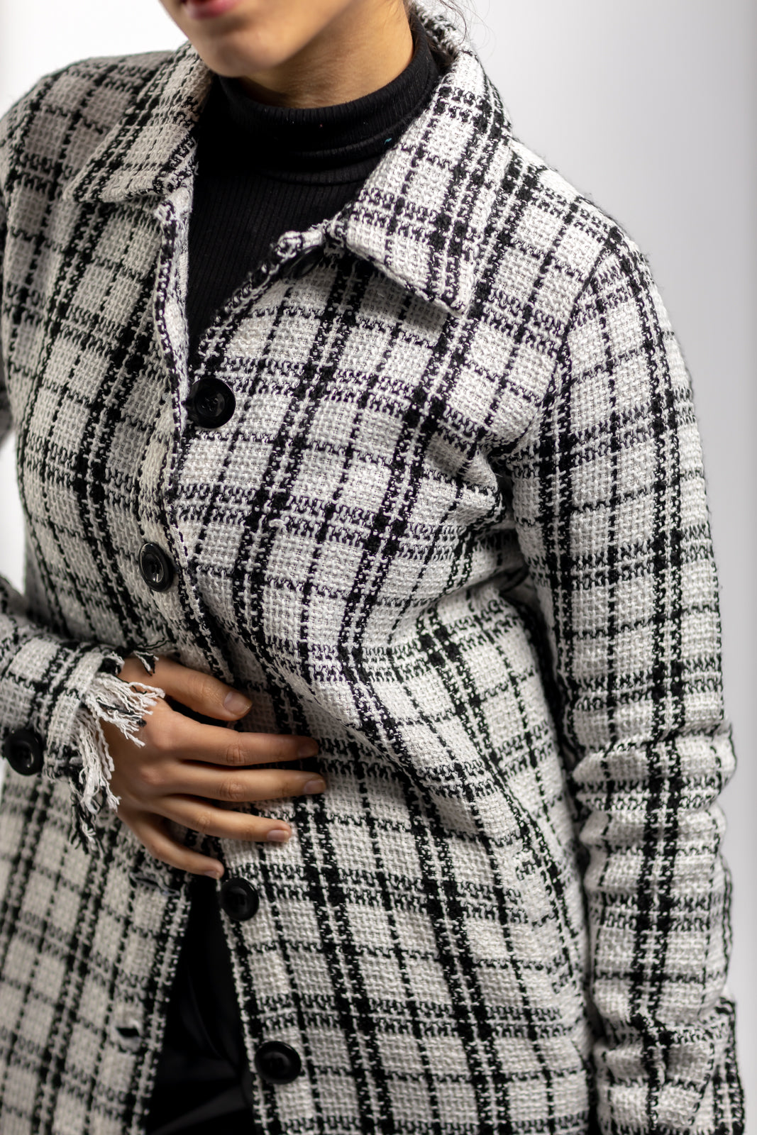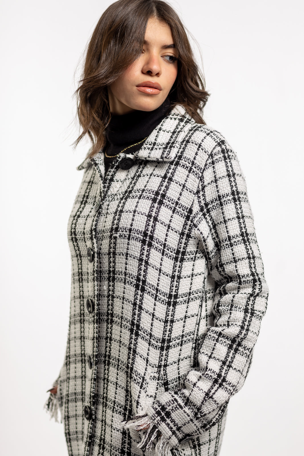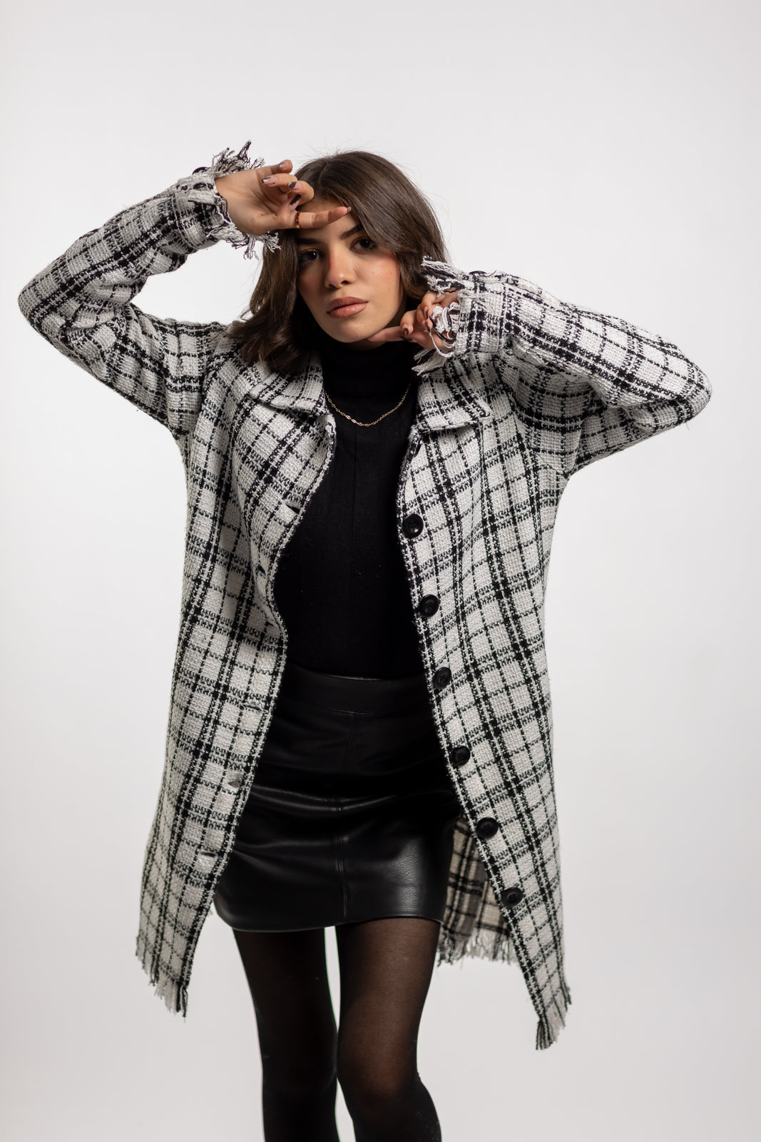 Stay warm and stylish with our Long Checkered Wool Shirts.With a classic checkered design and soft wool material, this shirt offers both functionality and fashion. The fringe detailing adds a unique touch, making it a must-have for any wardrobe. Stay cozy and on-trend this season with our checkered wool shirt. shirt