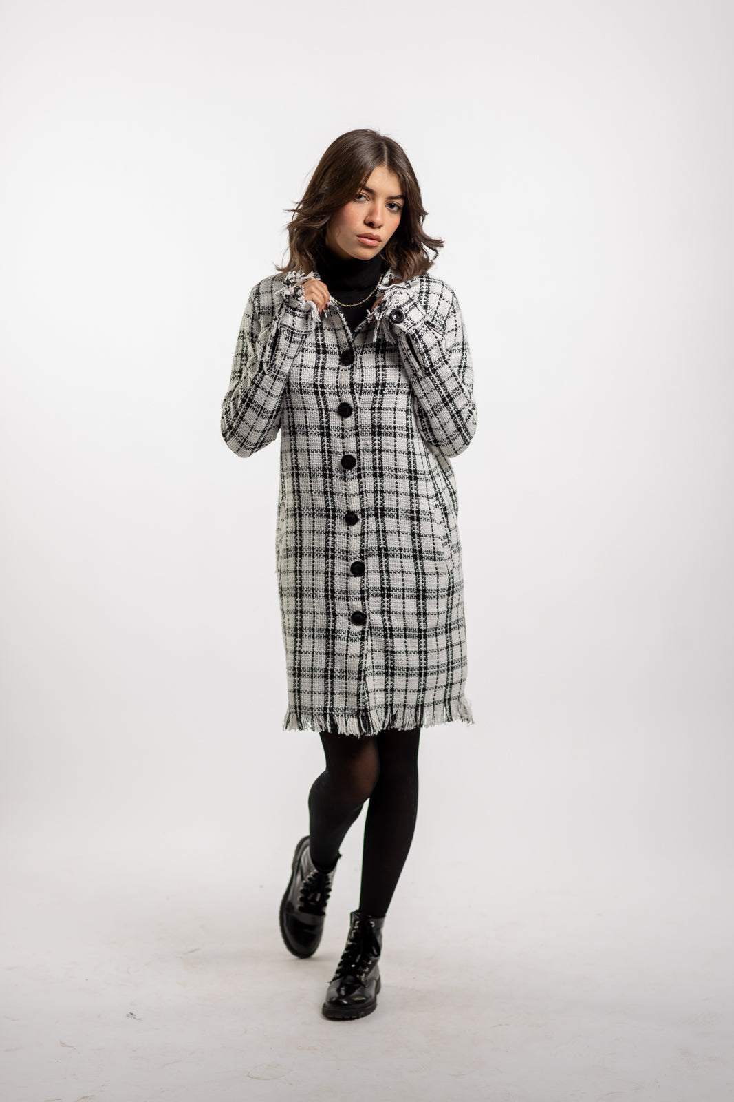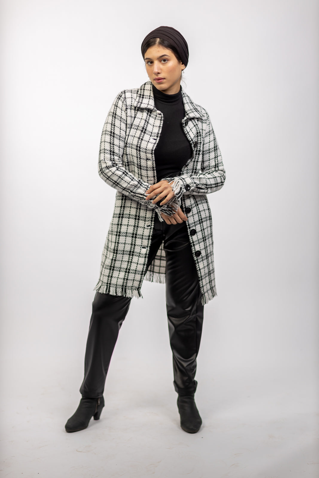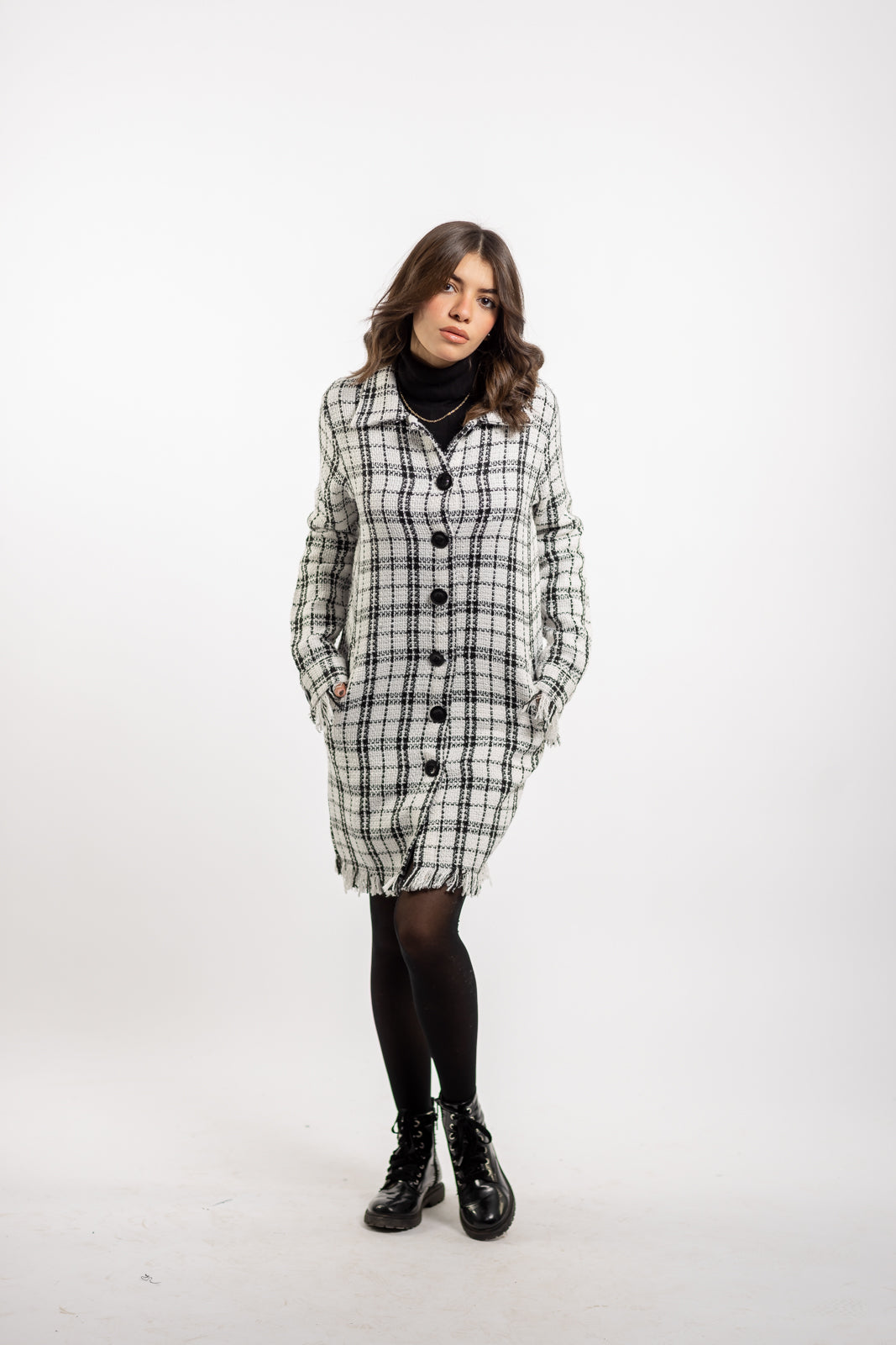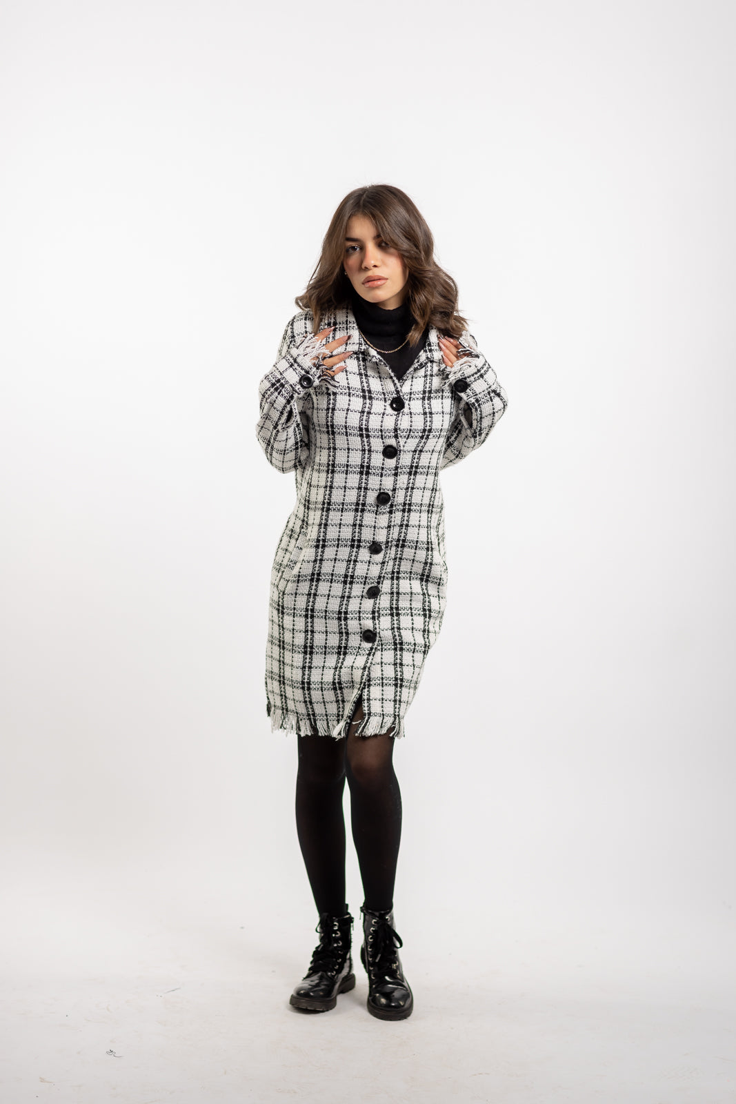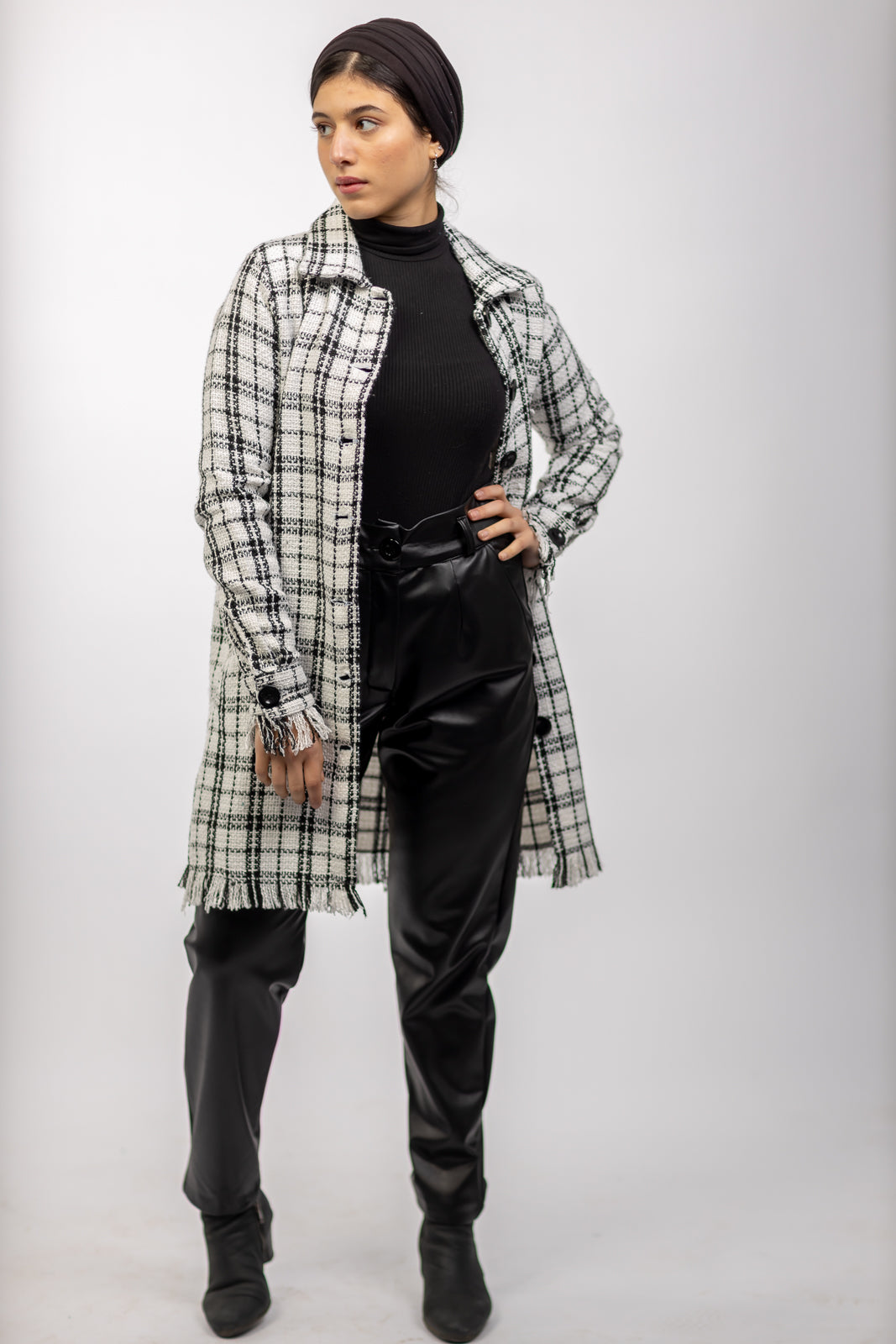 Stay warm and stylish with our Long Checkered Wool Shirts.With a classic checkered design and soft wool material, this shirt offers both functionality and fashion. The fringe detailing adds a unique touch, making it a must-have for any wardrobe. Stay cozy and on-trend this season with our checkered wool shirt. shirt