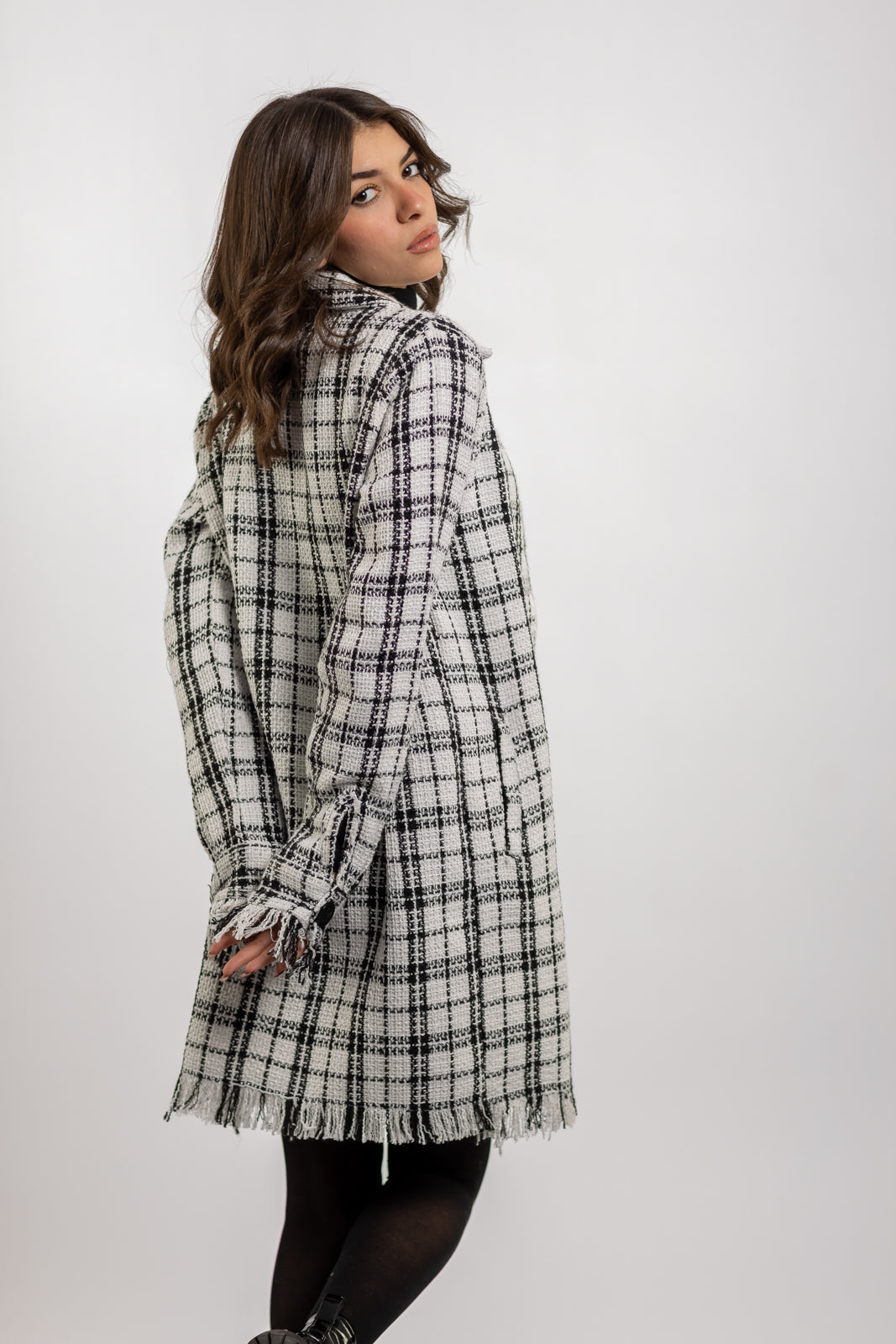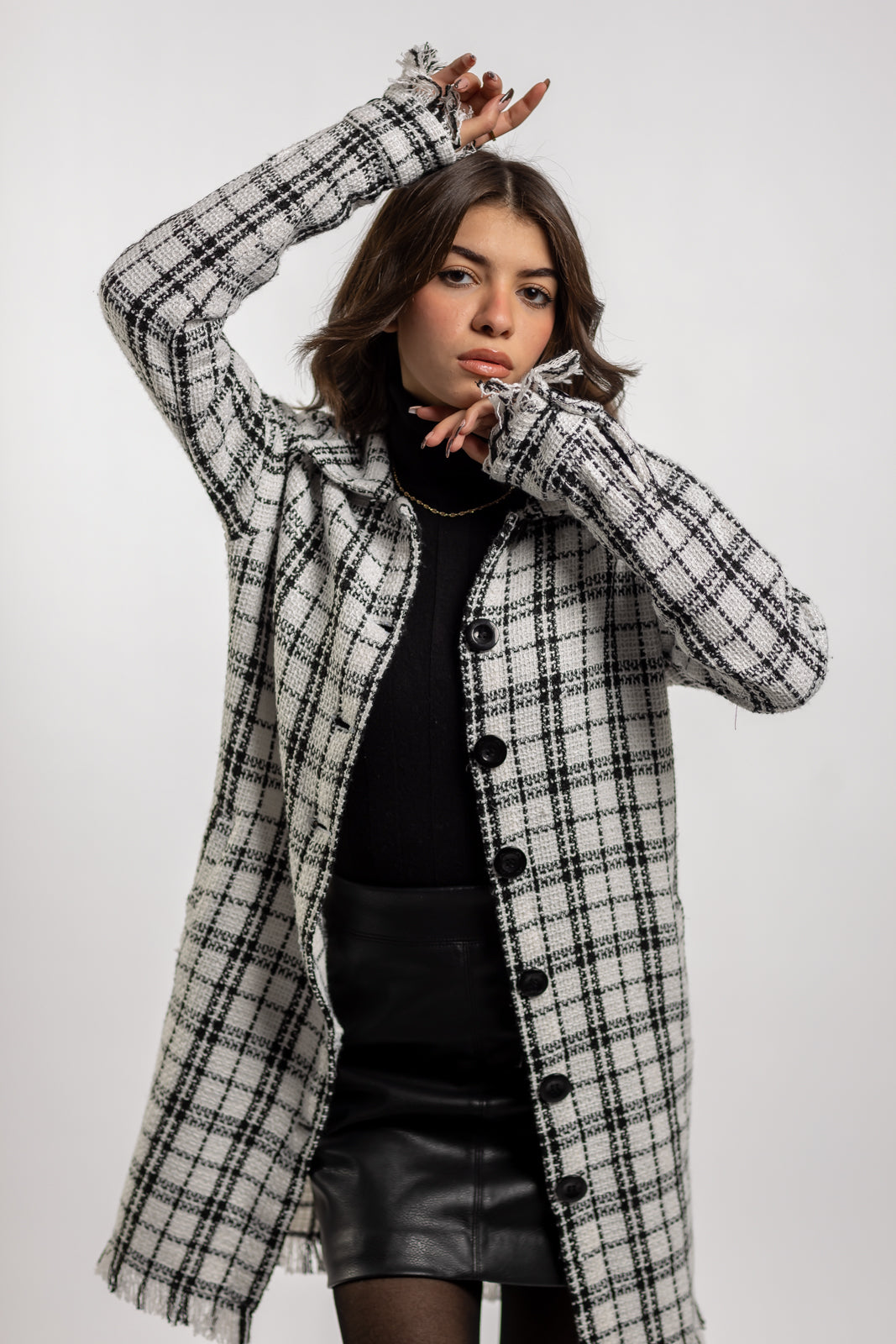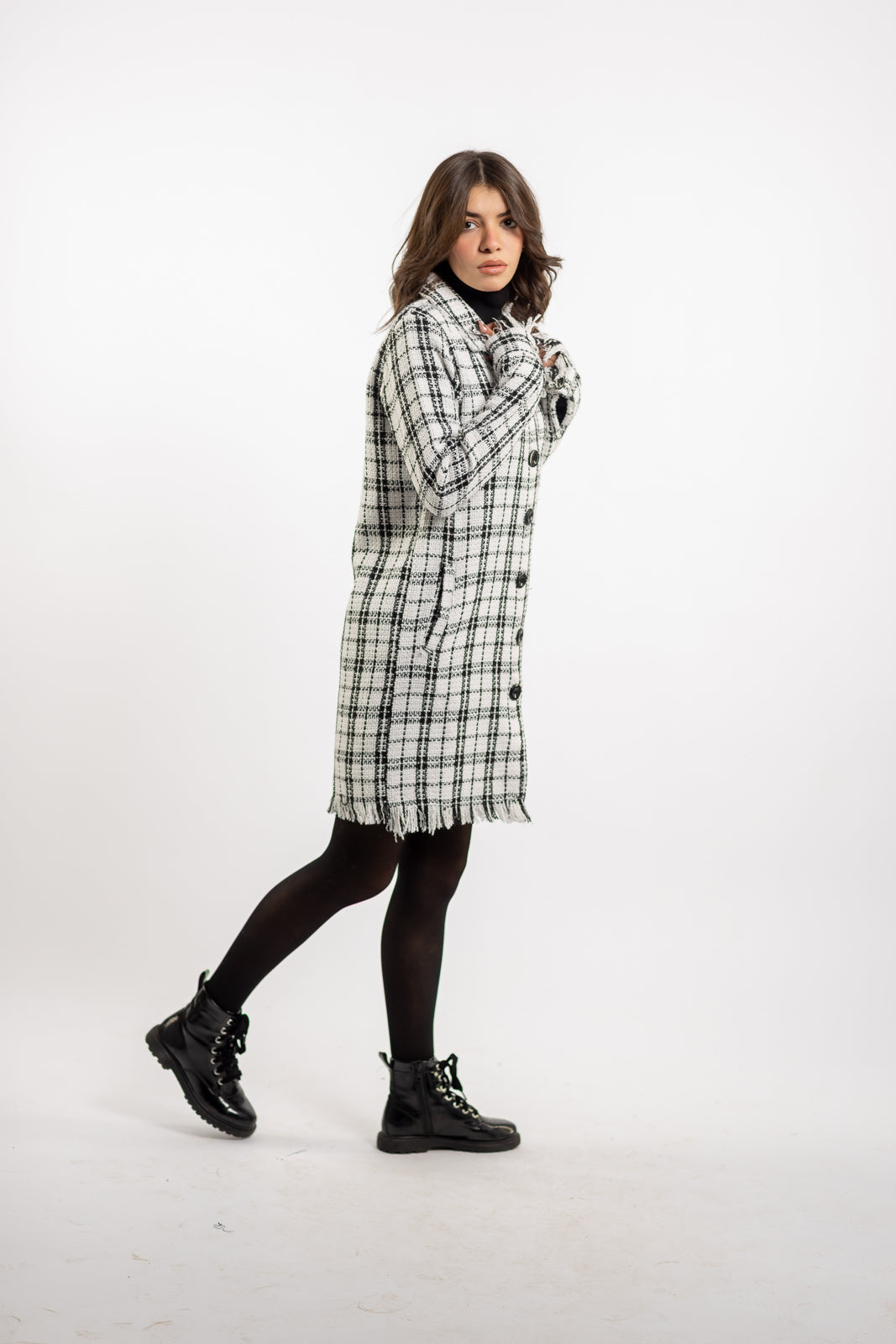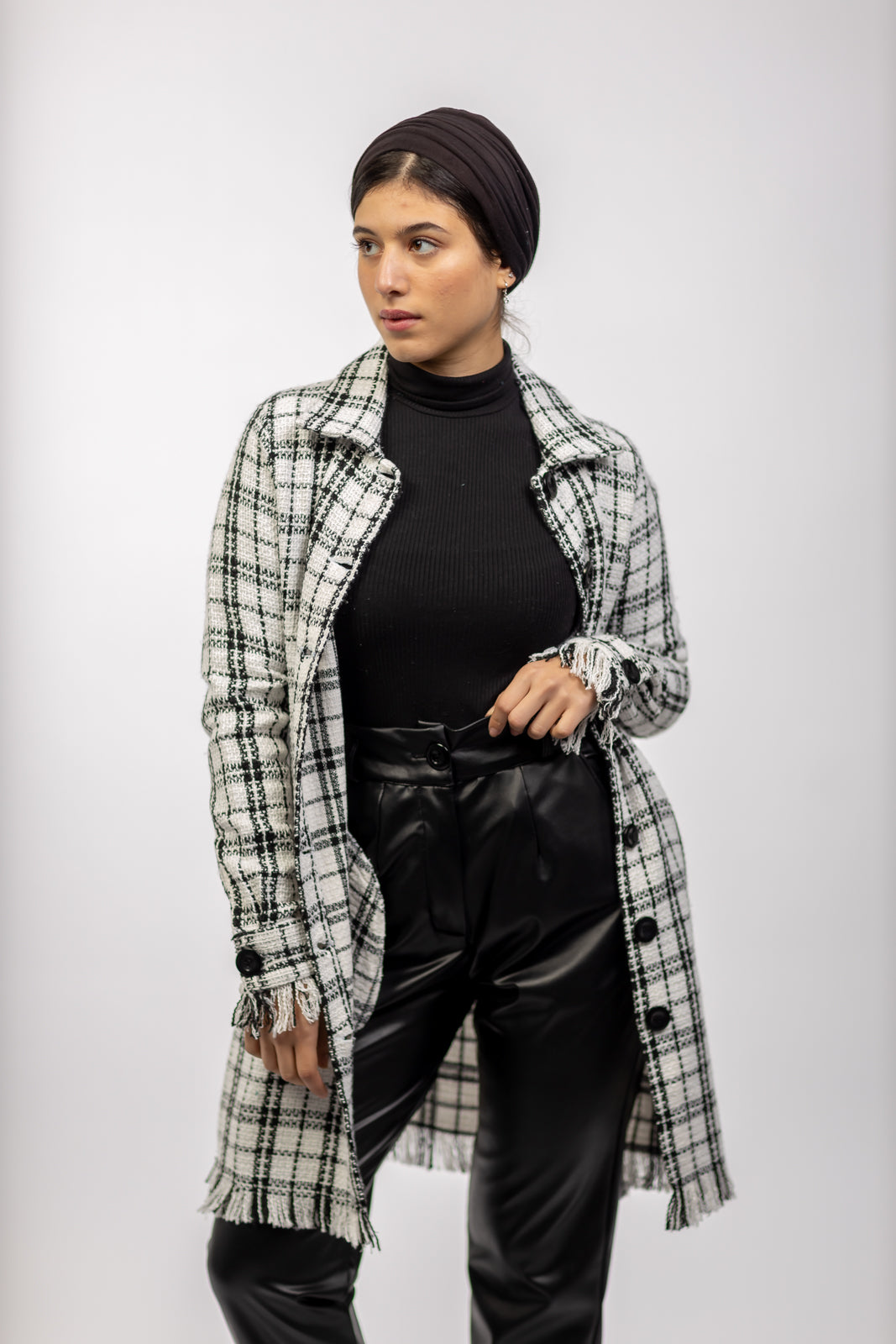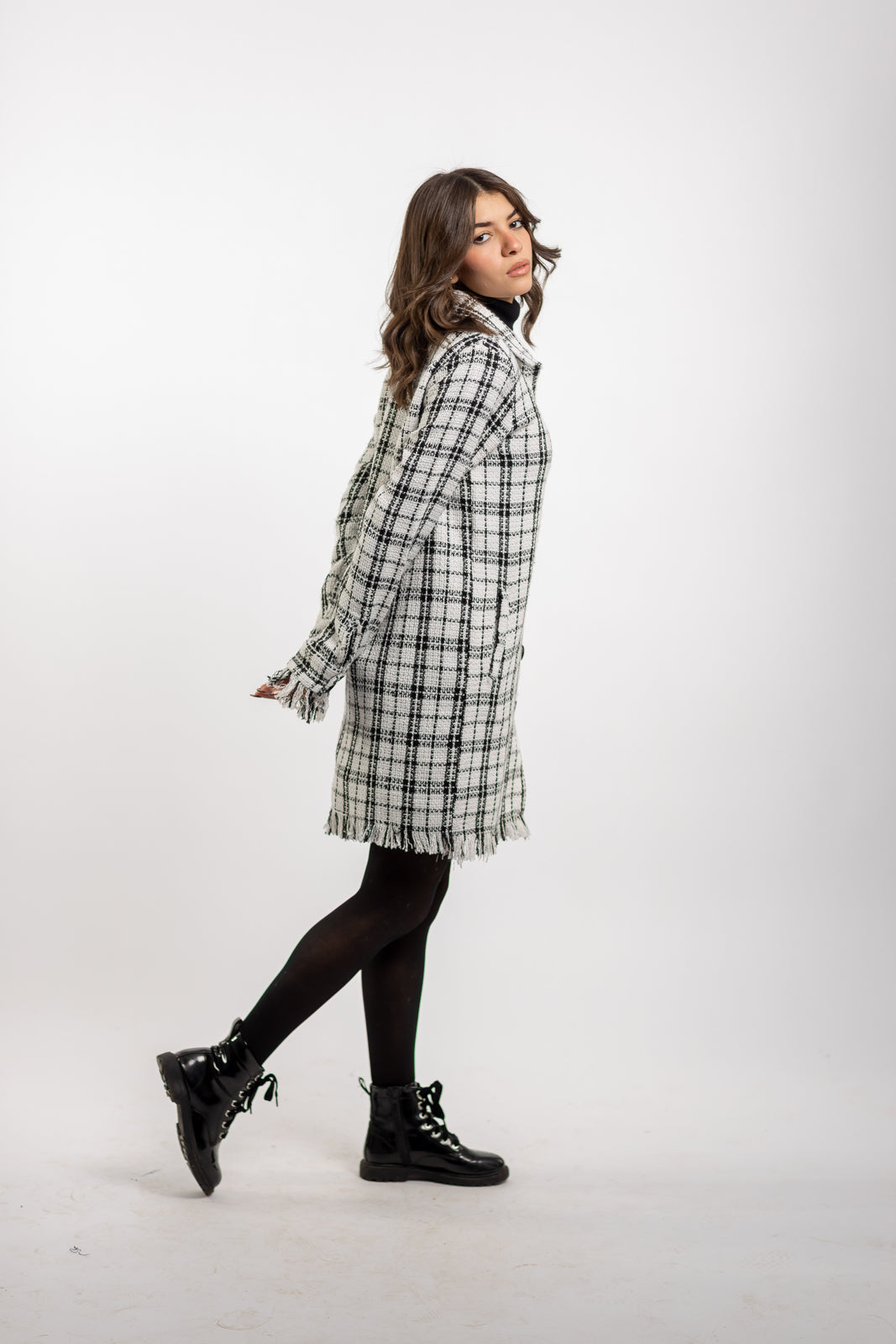 Stay warm and stylish with our Long Checkered Wool Shirts.With a classic checkered design and soft wool material, this shirt offers both functionality and fashion. The fringe detailing adds a unique touch, making it a must-have for any wardrobe. Stay cozy and on-trend this season with our checkered wool shirt. shirt