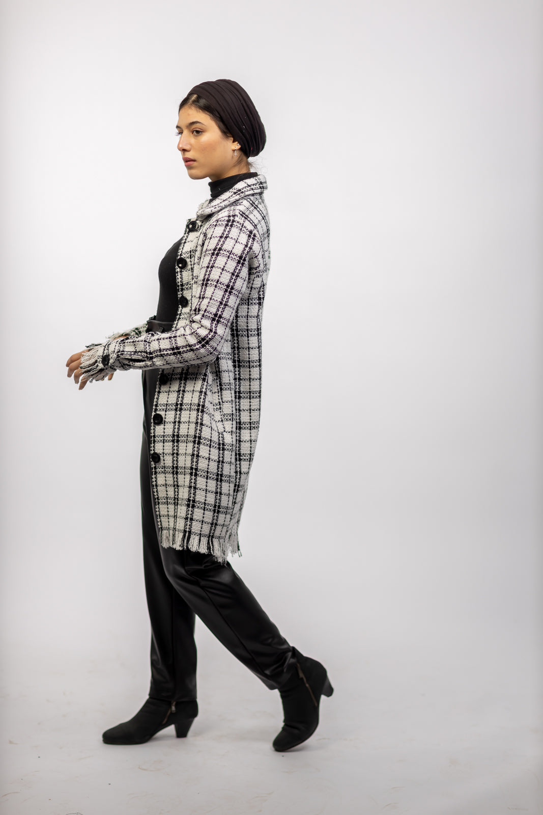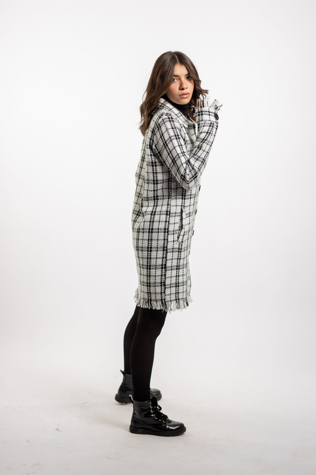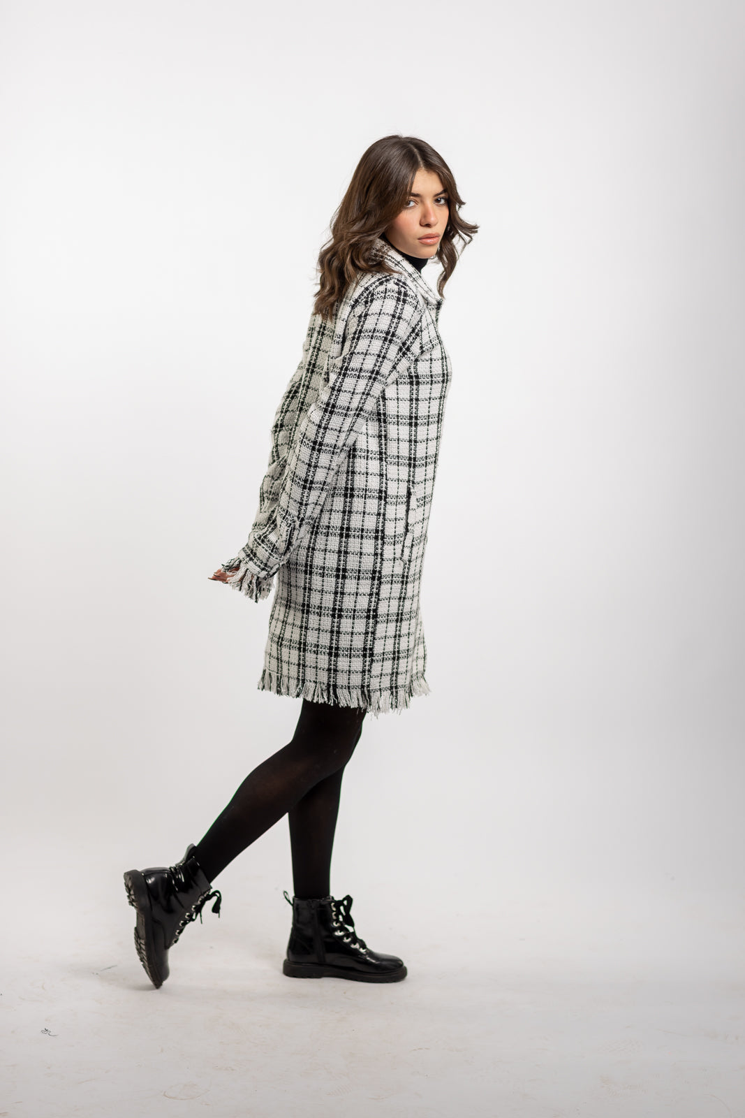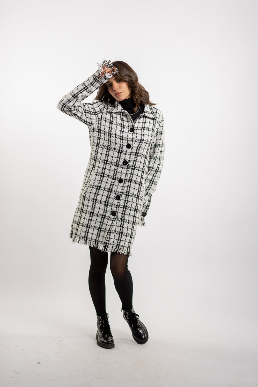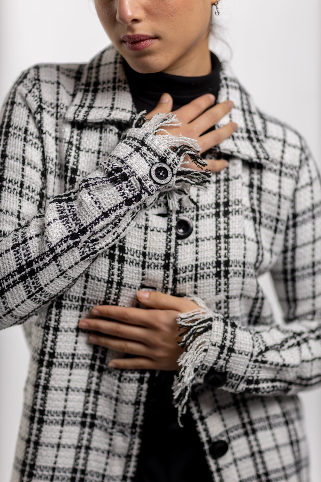 Stay warm and stylish with our Long Checkered Wool Shirts.With a classic checkered design and soft wool material, this shirt offers both functionality and fashion. The fringe detailing adds a unique touch, making it a must-have for any wardrobe. Stay cozy and on-trend this season with our checkered wool shirt. shirt