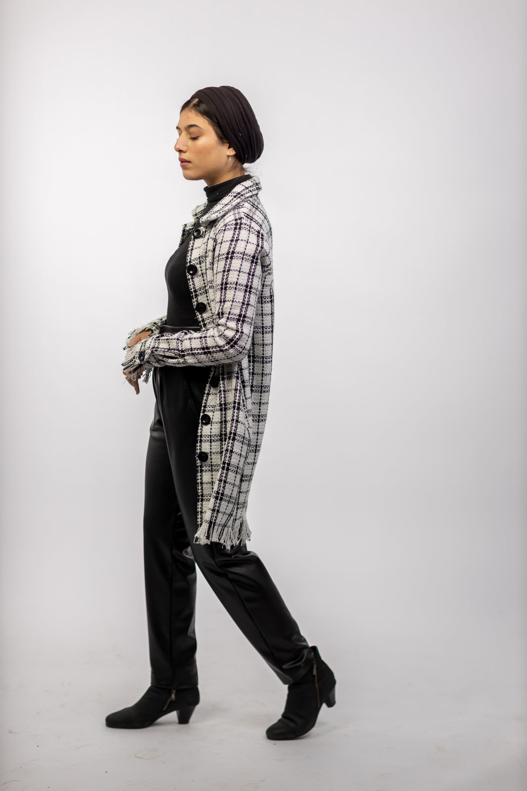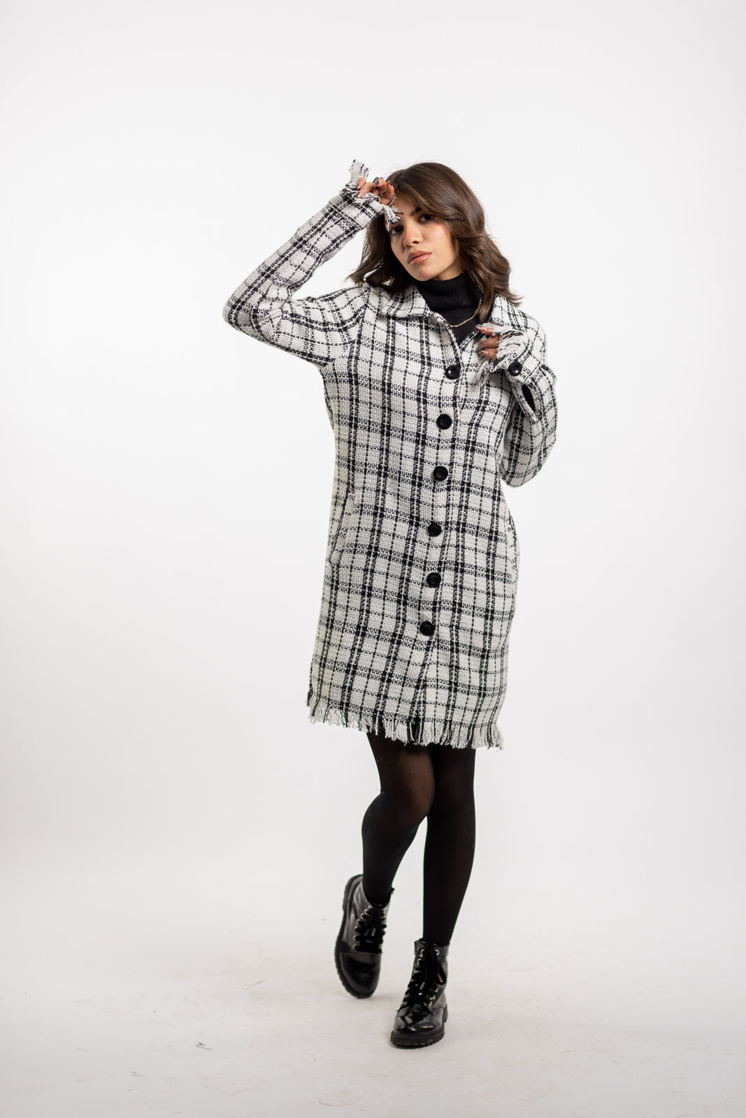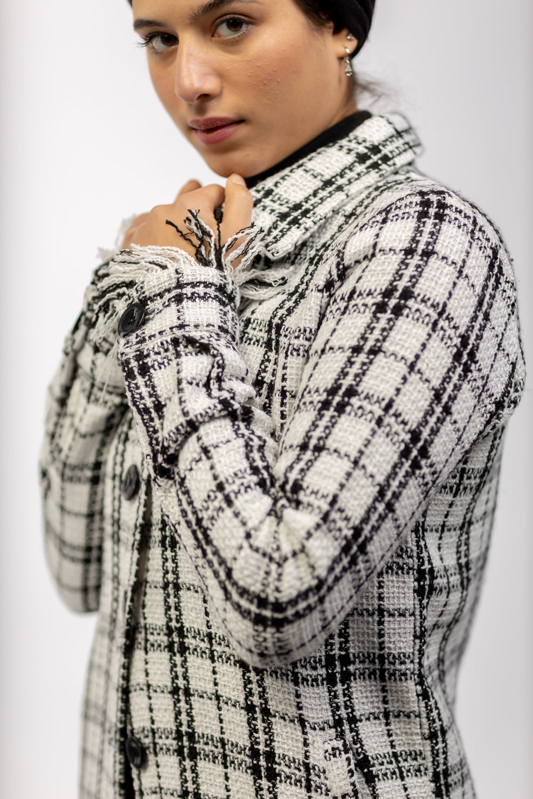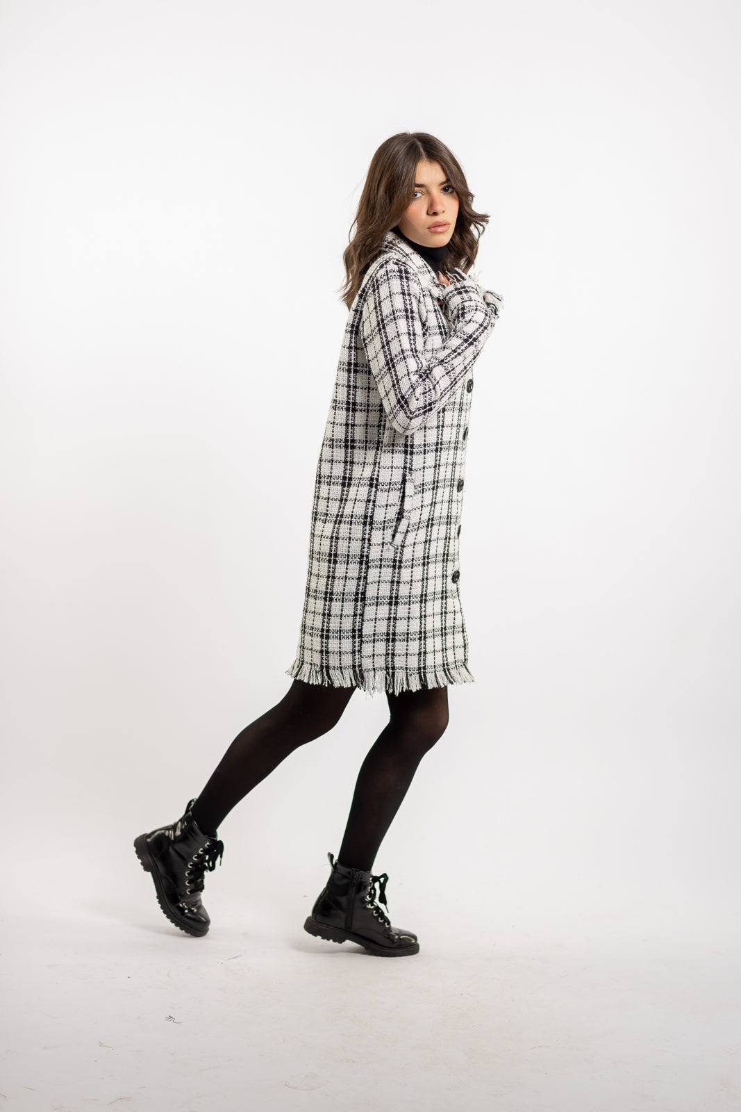 Stay warm and stylish with our Long Checkered Wool Shirts.With a classic checkered design and soft wool material, this shirt offers both functionality and fashion. The fringe detailing adds a unique touch, making it a must-have for any wardrobe. Stay cozy and on-trend this season with our checkered wool shirt. shirt