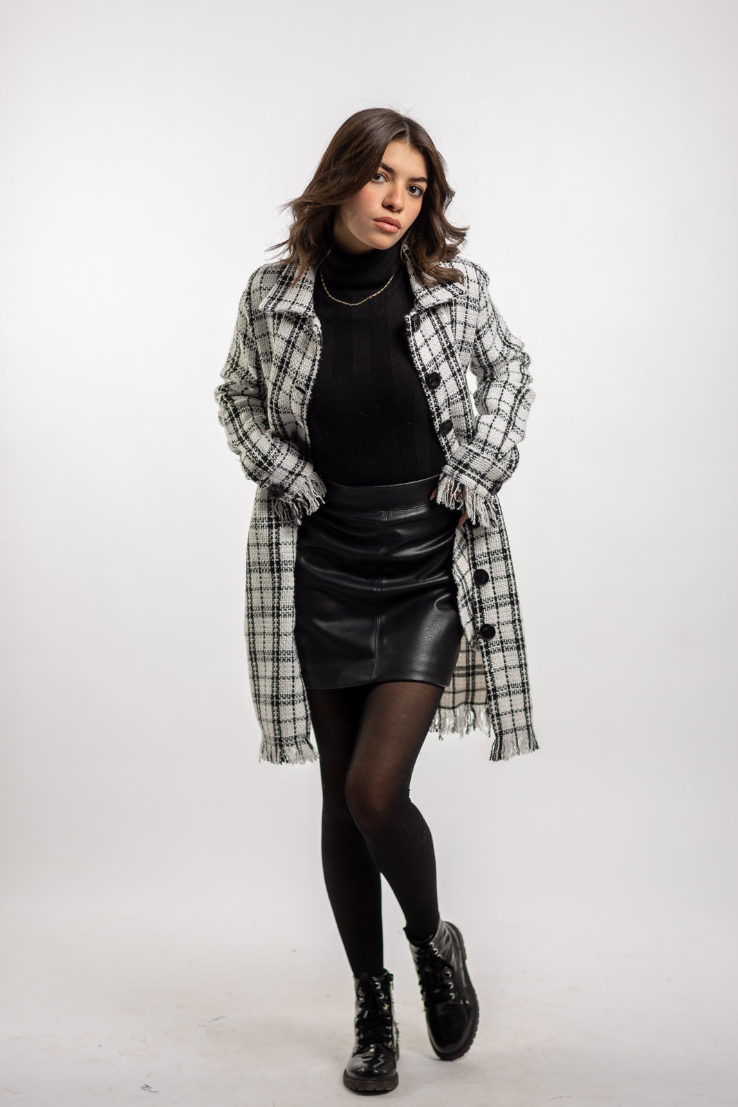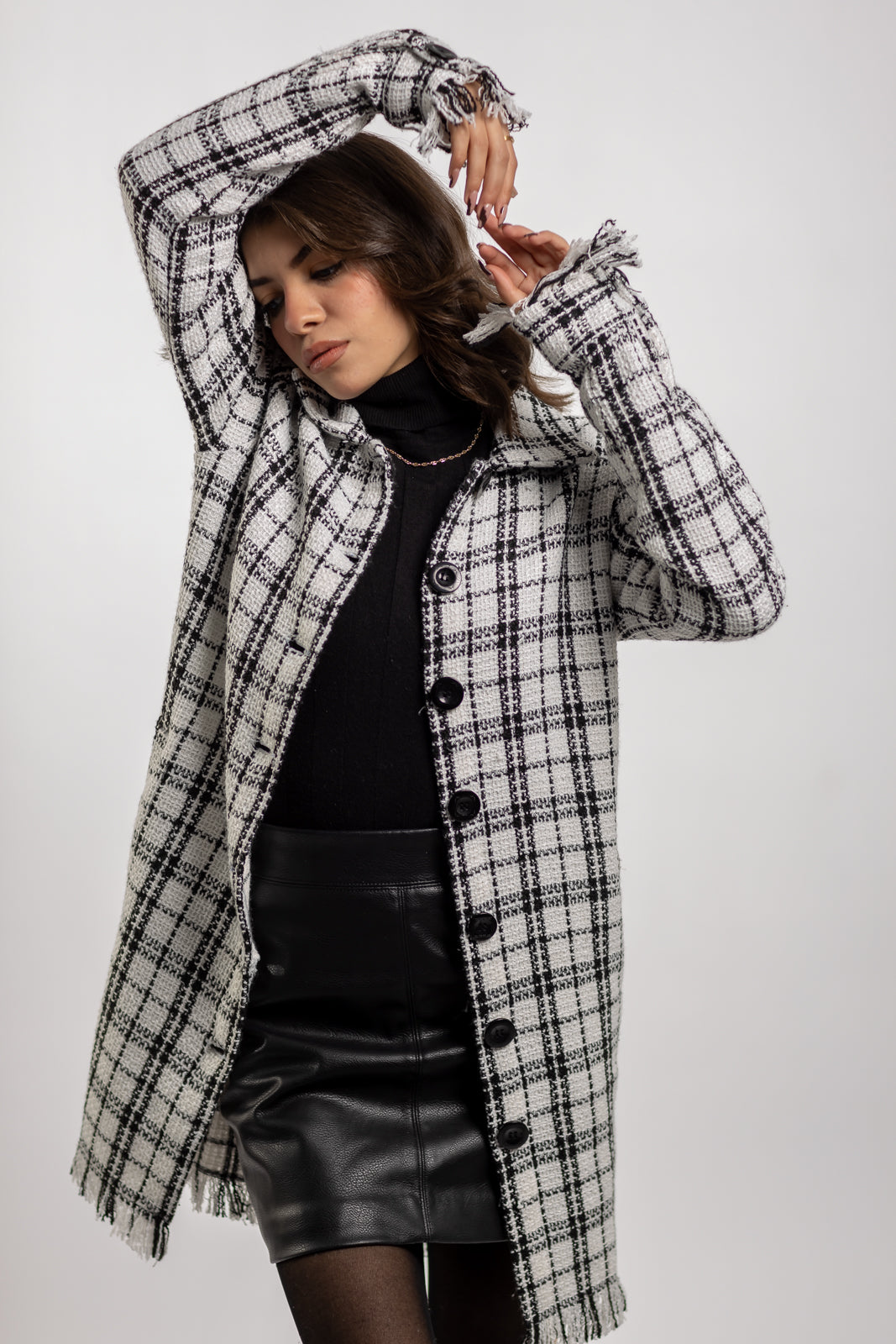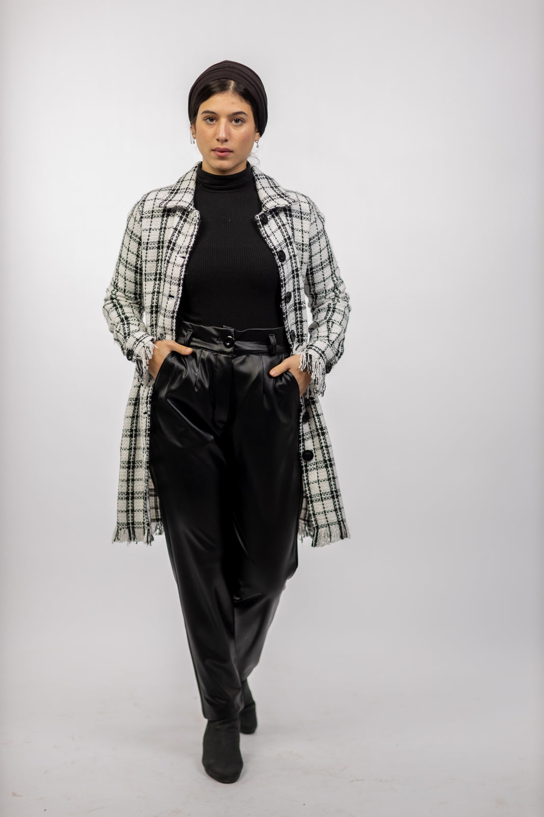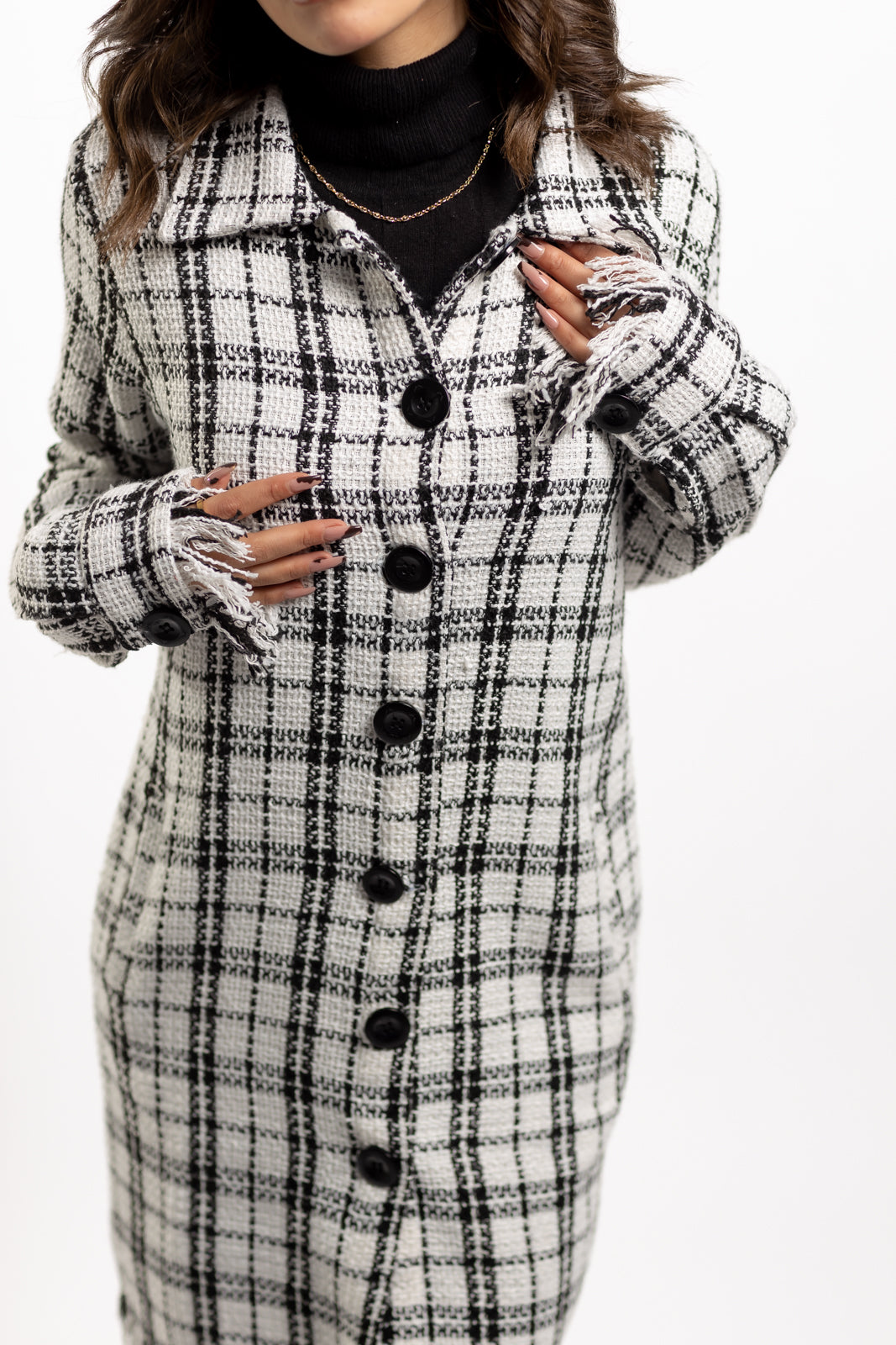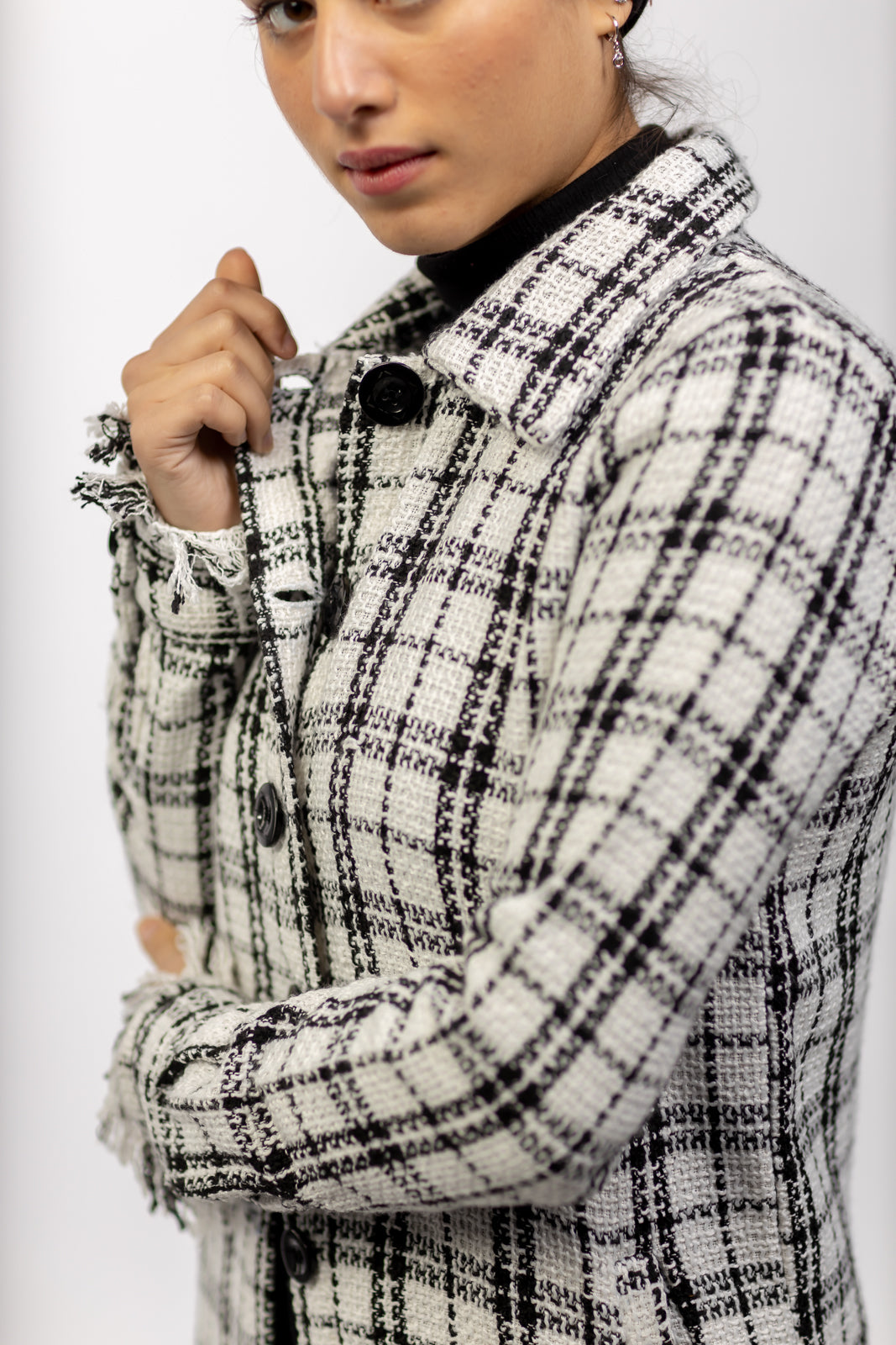 Stay warm and stylish with our Long Checkered Wool Shirts.With a classic checkered design and soft wool material, this shirt offers both functionality and fashion. The fringe detailing adds a unique touch, making it a must-have for any wardrobe. Stay cozy and on-trend this season with our checkered wool shirt. shirt